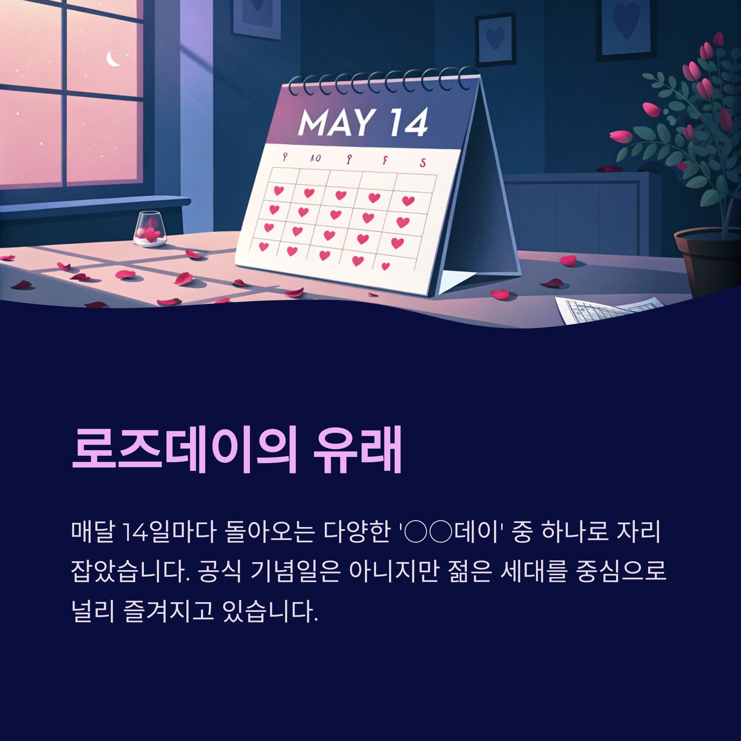 로즈데이의 정확한 유래는 명확하지 않으나, 매달 14일마다 돌아오는 다양한 기념일 문화 중 하나로 자리 잡았습니다. 5월 14일이 연인들끼리 장미꽃을 주고받는 날로 알려져 있으며, 달력에 공식적으로 표기된 기념일은 아니지만 젊은 세대를 중심으로 널리 즐겨지고 있습니다.