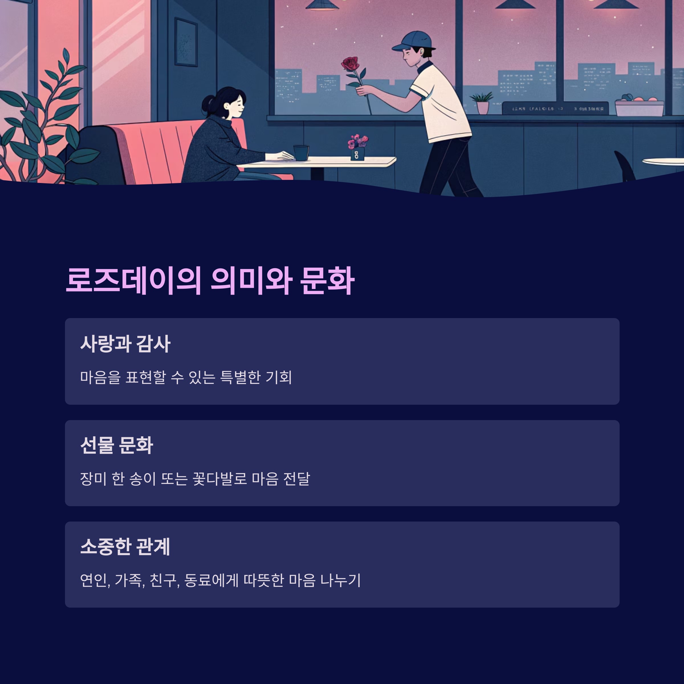 로즈데이는 단순히 연인 간의 기념일에 그치지 않고, 가족, 친구, 동료 등 소중한 사람들에게도 감사의 마음을 전하는 날로 확장되고 있습니다. 특히 부모님께 감사의 마음을 전하거나, 오랜 친구에게 우정을 확인하는 의미로 장미를 선물하는 문화도 점차 자리잡고 있습니다.
