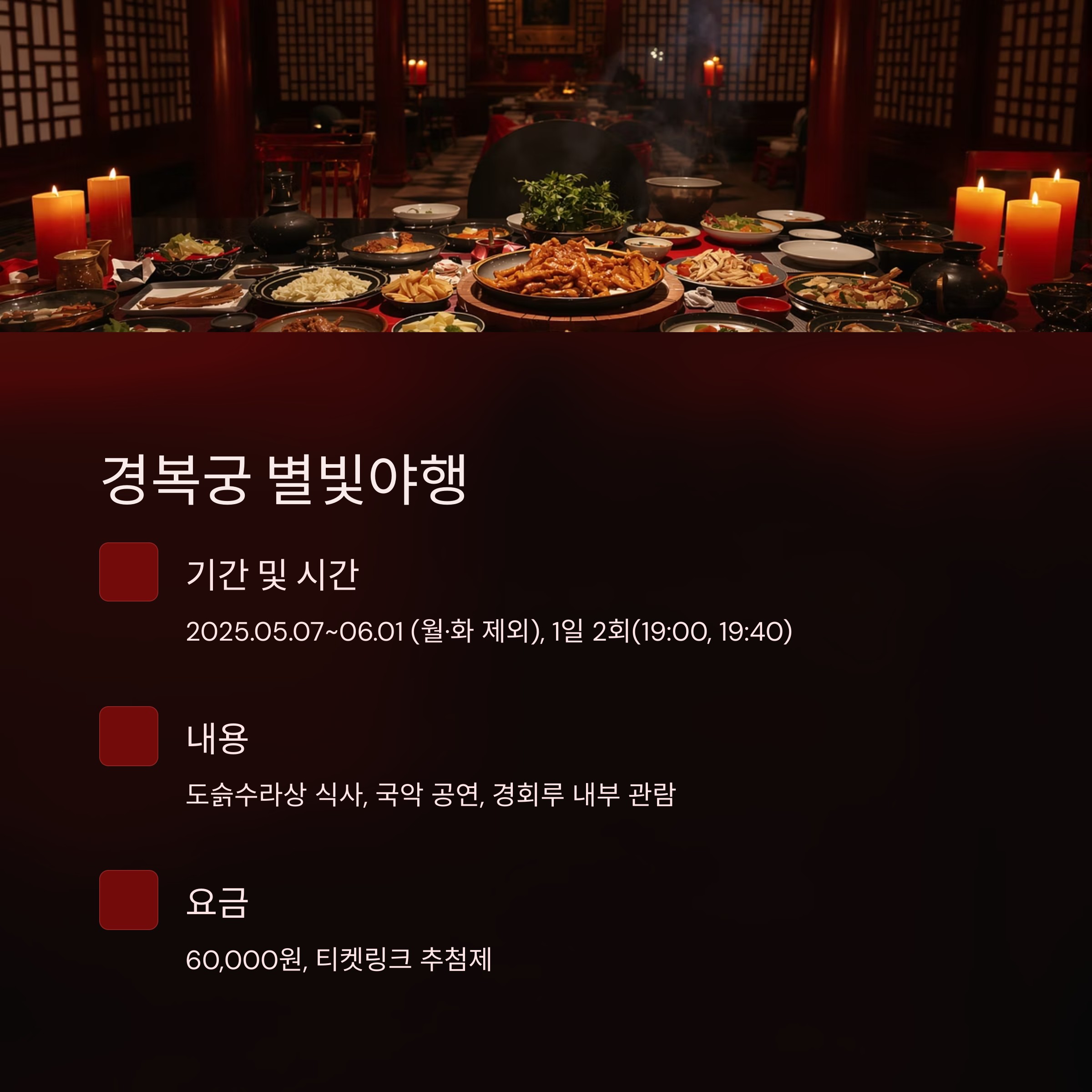 | 내용 | 소주방에서 도슭수라상(12첩 반상) 식사, 국악 공연, 경회루 내부 관람, 외소주방·집옥재 야간 투어 |