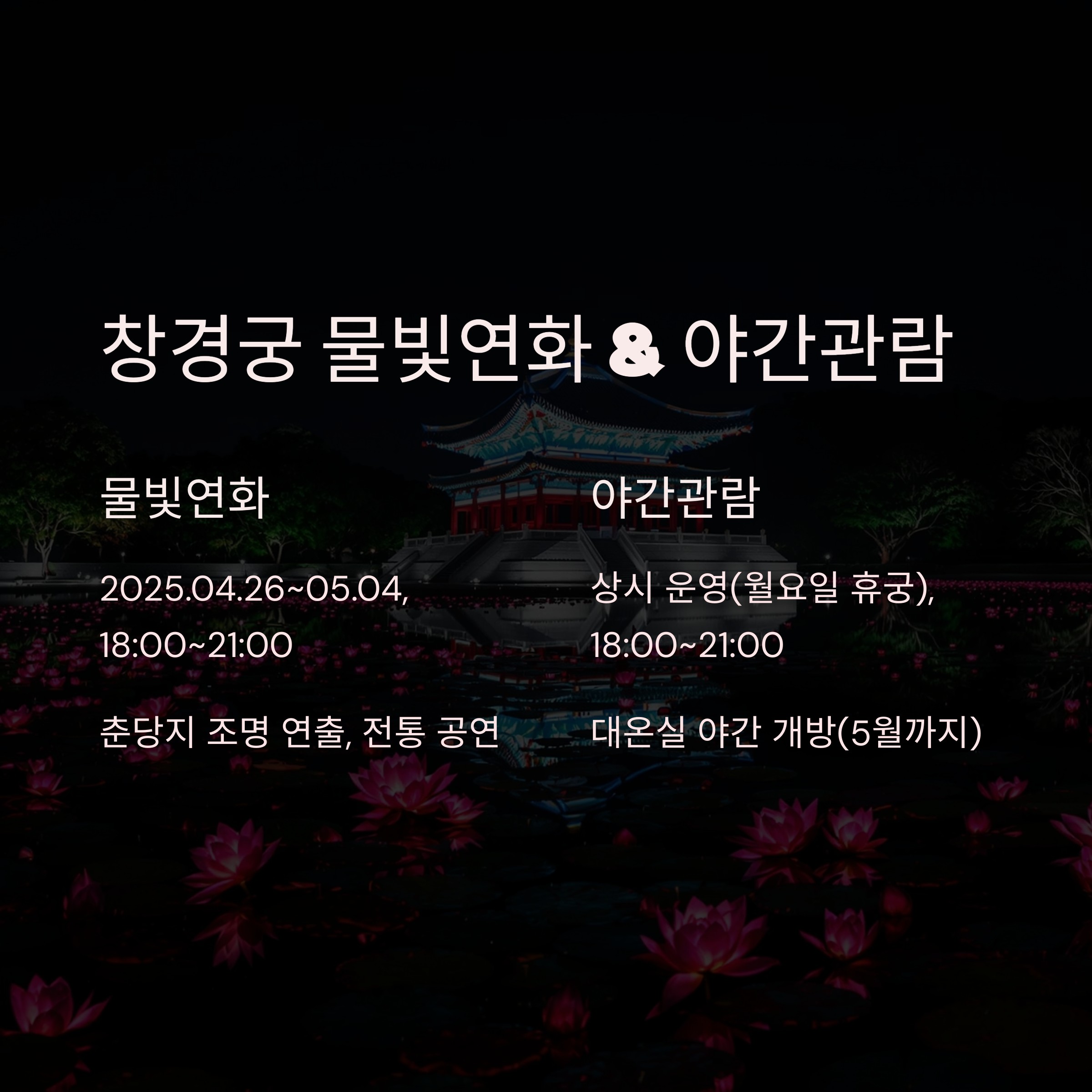 | 내용 | 홍화문, 명정전, 통명전, 춘당지, 대온실 야경 관람, 대온실은 5월까지 야간 개방 |
