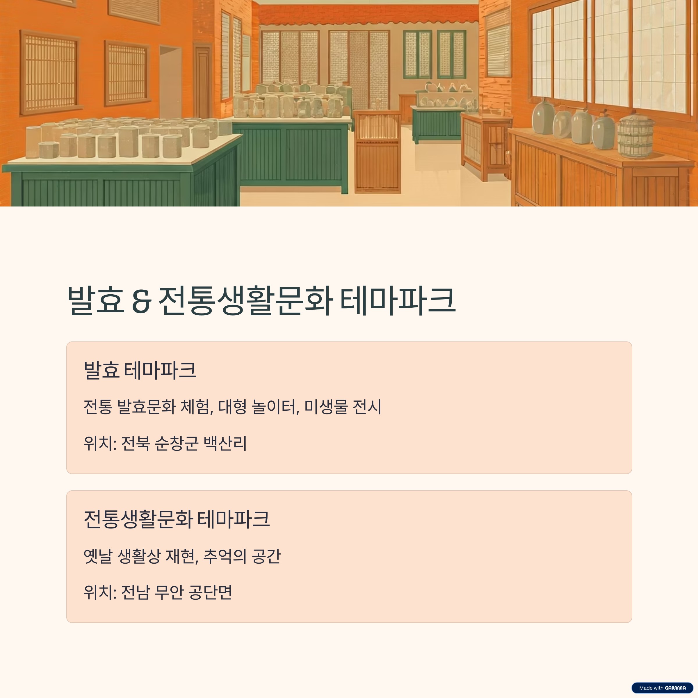 발효 테마파크는 전통 발효문화를 현대적으로 재해석한 교육형 테마파크입니다. 아이들이 미생물의 세계를 재미있게 탐험할 수 있습니다.