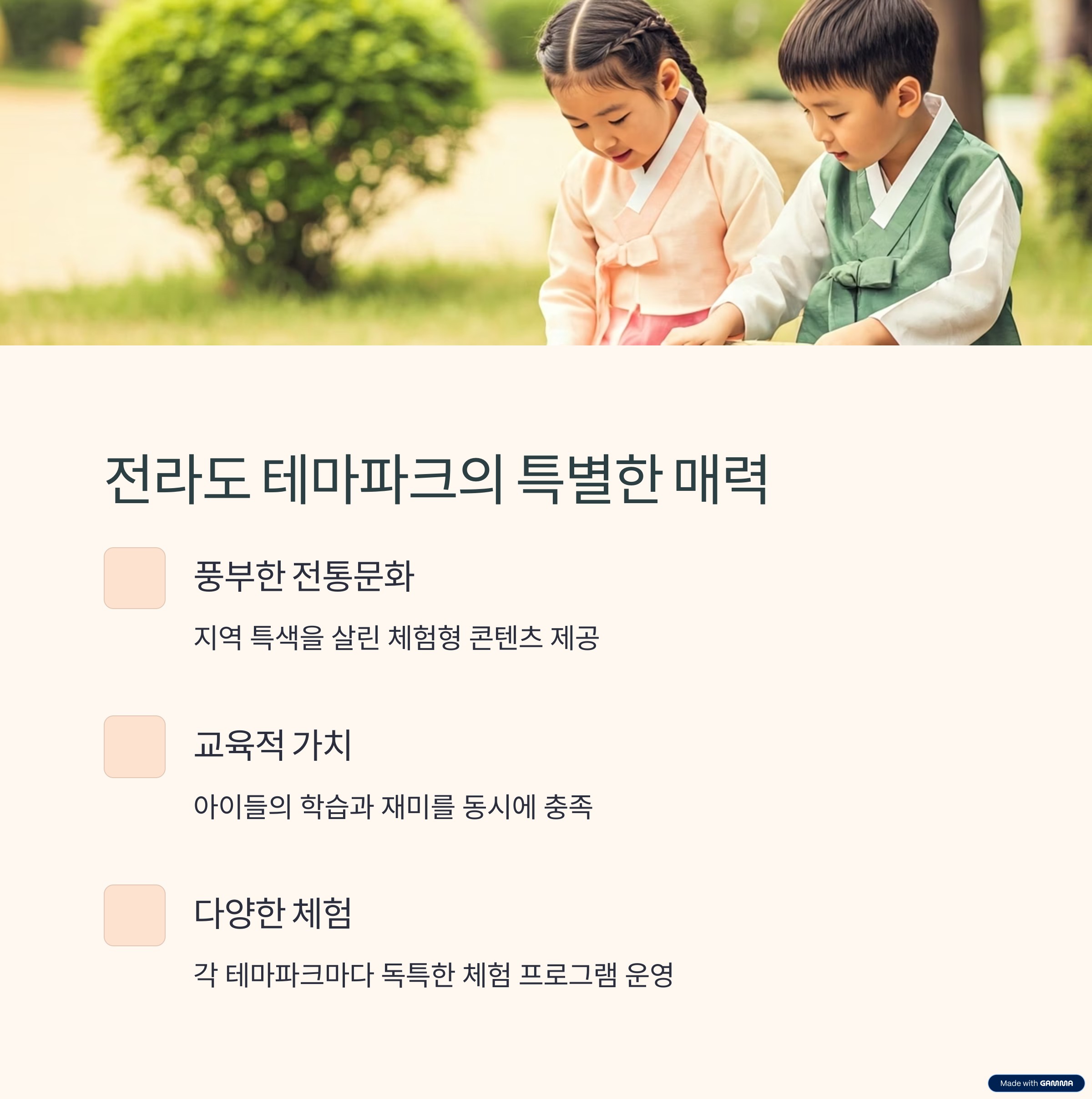 전라도는 풍부한 전통문화와 자연환경을 바탕으로 한 독특한 테마파크들로 유명합니다. 각 테마파크는 지역의 특색을 살린 체험형 콘텐츠를 제공하여 아이들의 교육과 재미를 동시에 만족시킵니다.