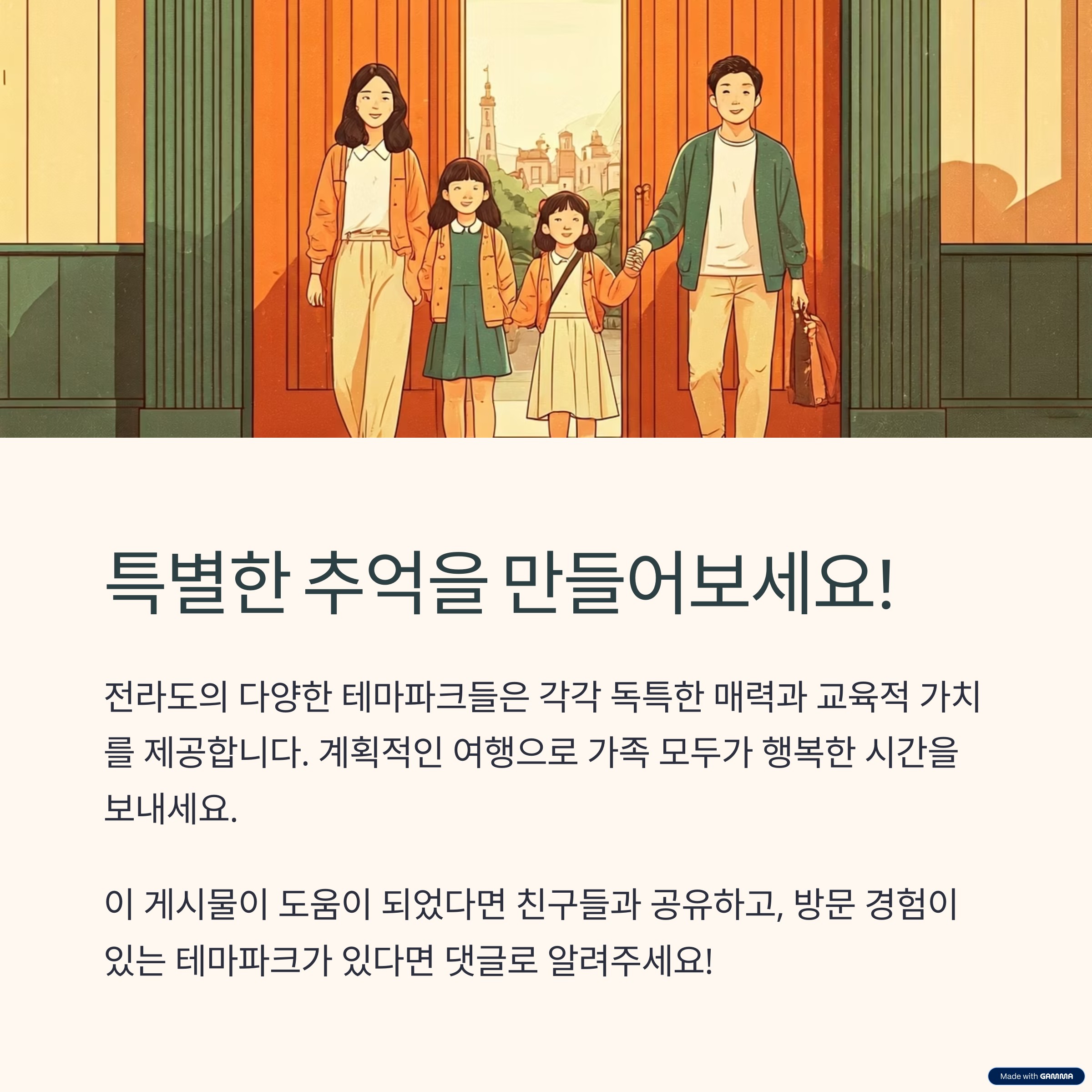 전라도의 다양한 테마파크들은 각각 독특한 매력과 교육적 가치를 제공합니다. 아이들과 함께 특별한 추억을 만들고 싶다면, 이 9곳의 테마파크를 차례로 방문해보세요. 가족 모두가 행복한 시간을 보낼 수 있을 것입니다!