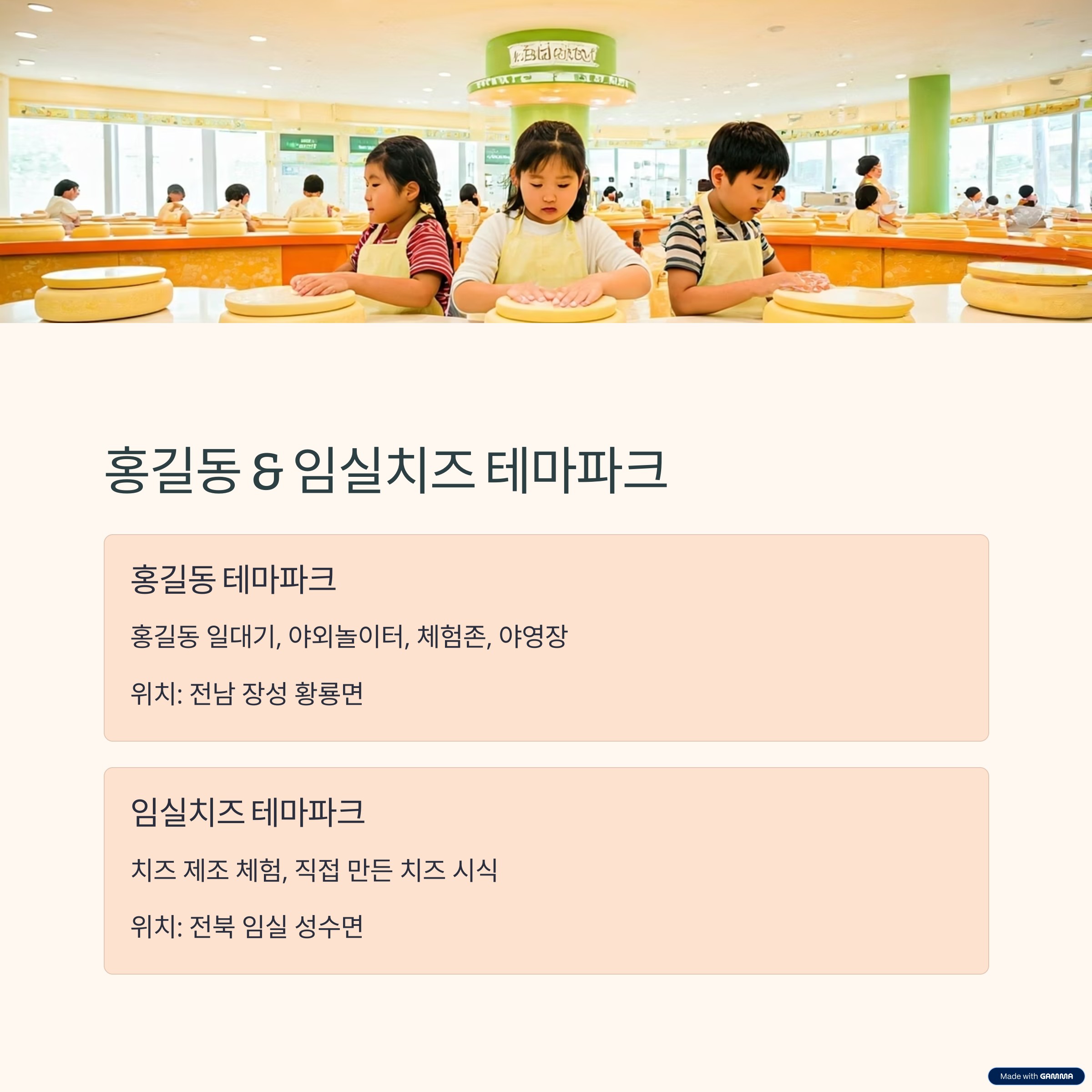 임실치즈 테마파크는 치즈 제조 과정을 직접 체험할 수 있는 곳입니다. 아이들이 직접 만든 치즈를 맛보는 특별한 경험을 할 수 있습니다.