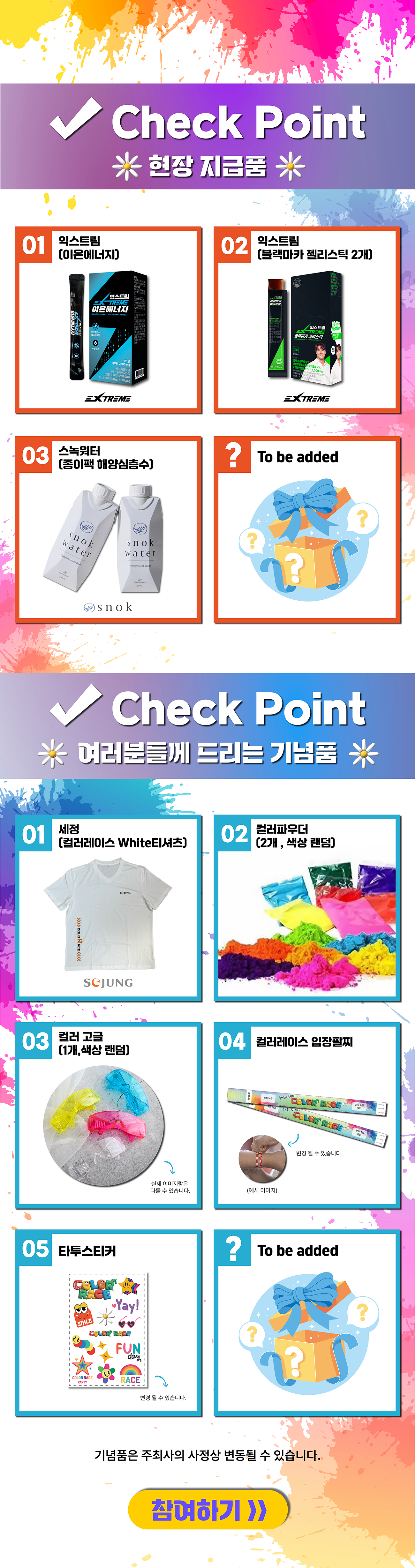 - 참가자 모두에게 대회기념품(티셔츠, 입장팔찌, 선글라스, 컬러파우더 2ea 등)을 드립니다.