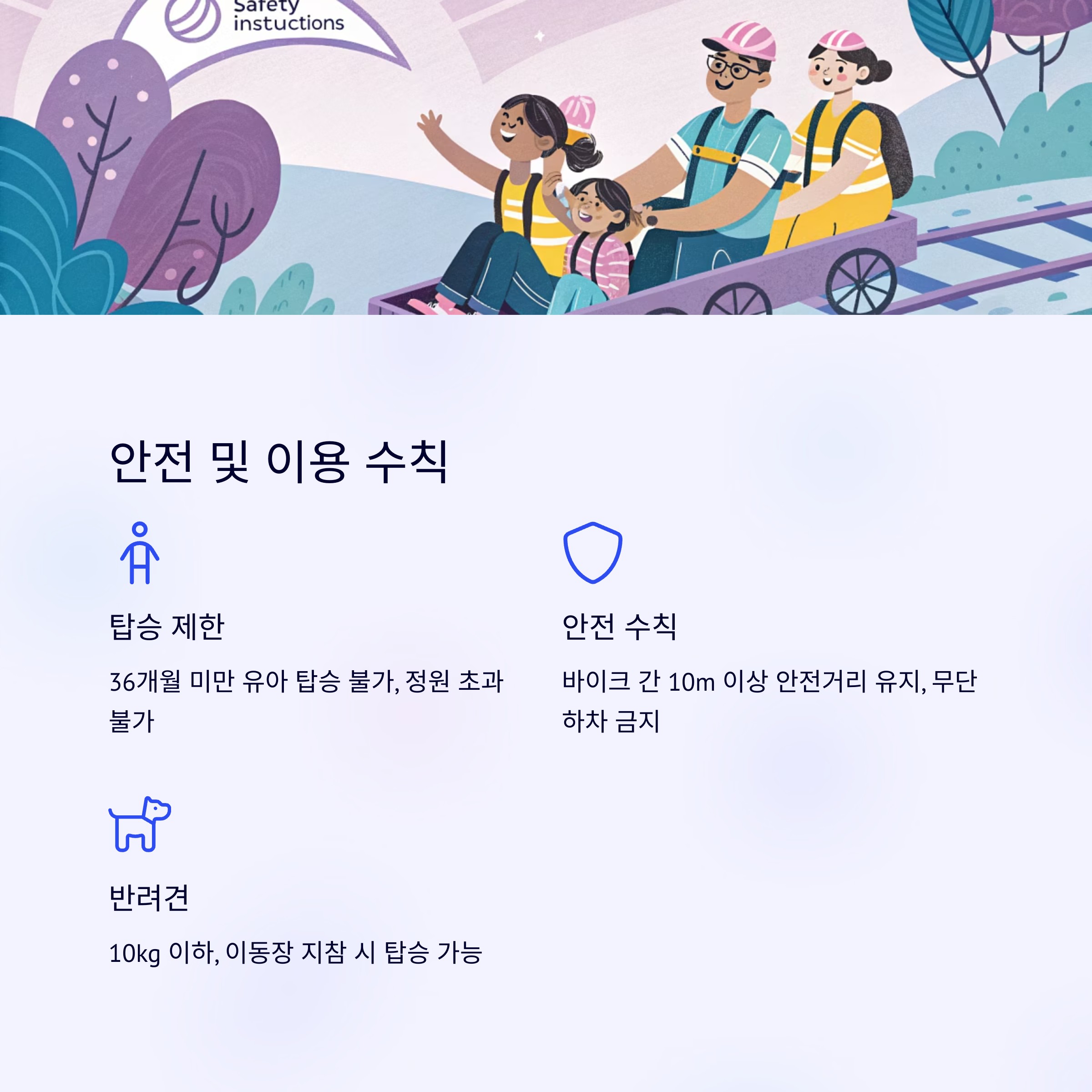 - 정원 초과 불가: 2인승/4인승 레일바이크의 정원을 초과하여 탑승할 수 없습니다.