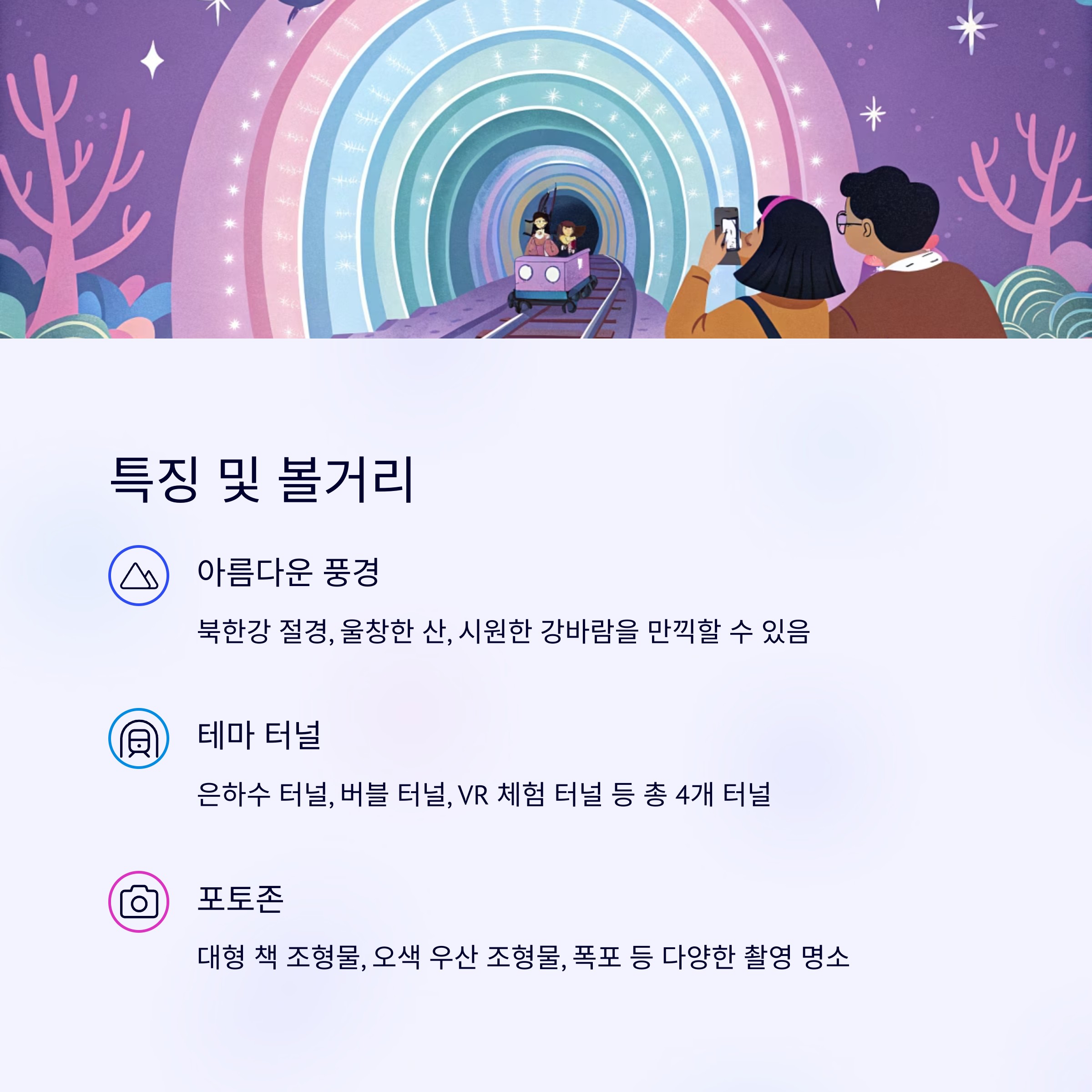 - 계절 테마 터널: 계절별로 다양한 테마로 꾸며지는 터널