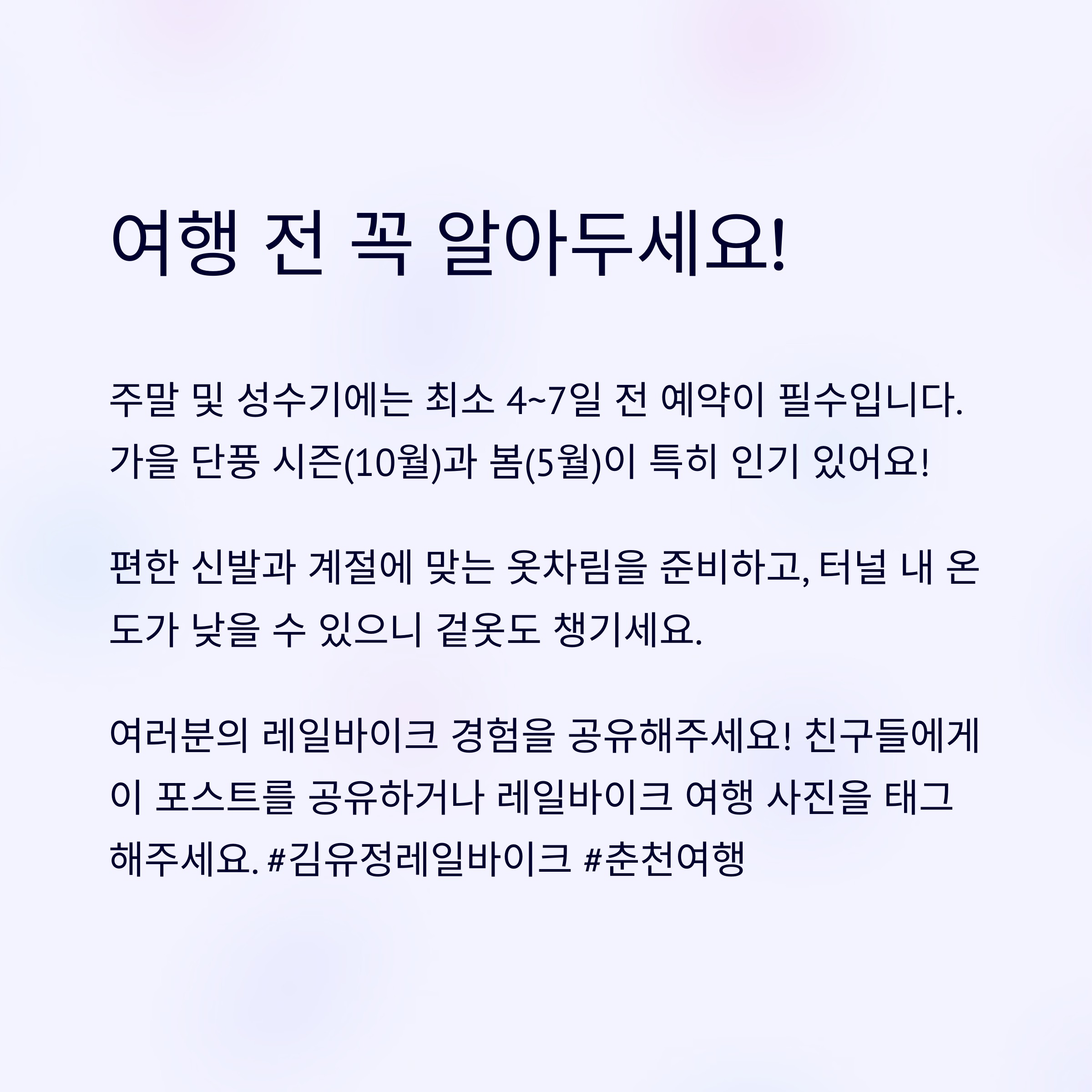- 날씨가 좋은 봄(5월)과 가을(10월)은 특히 인기가 많으니 더 여유 있게 예약하세요.