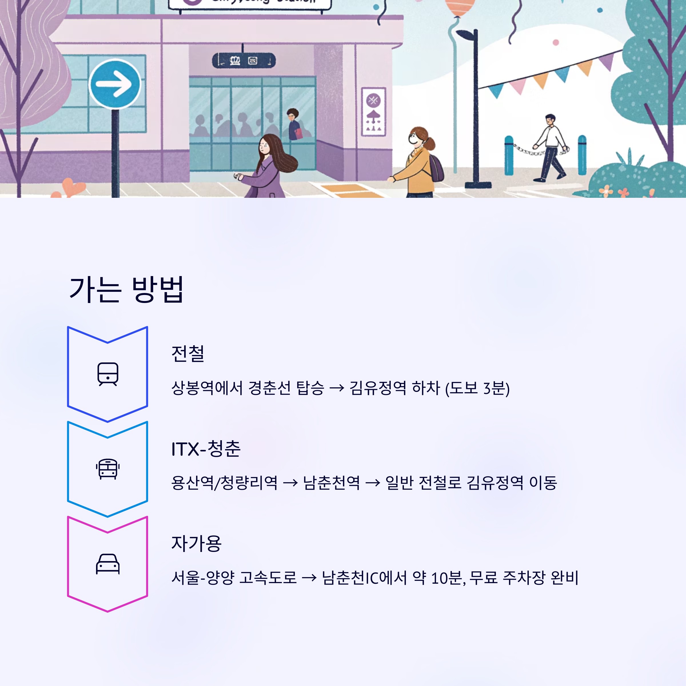 | 전철 | 상봉역에서 경춘선 탑승 → 김유정역 하차 (1번 출구) | 약 1시간 20분 |