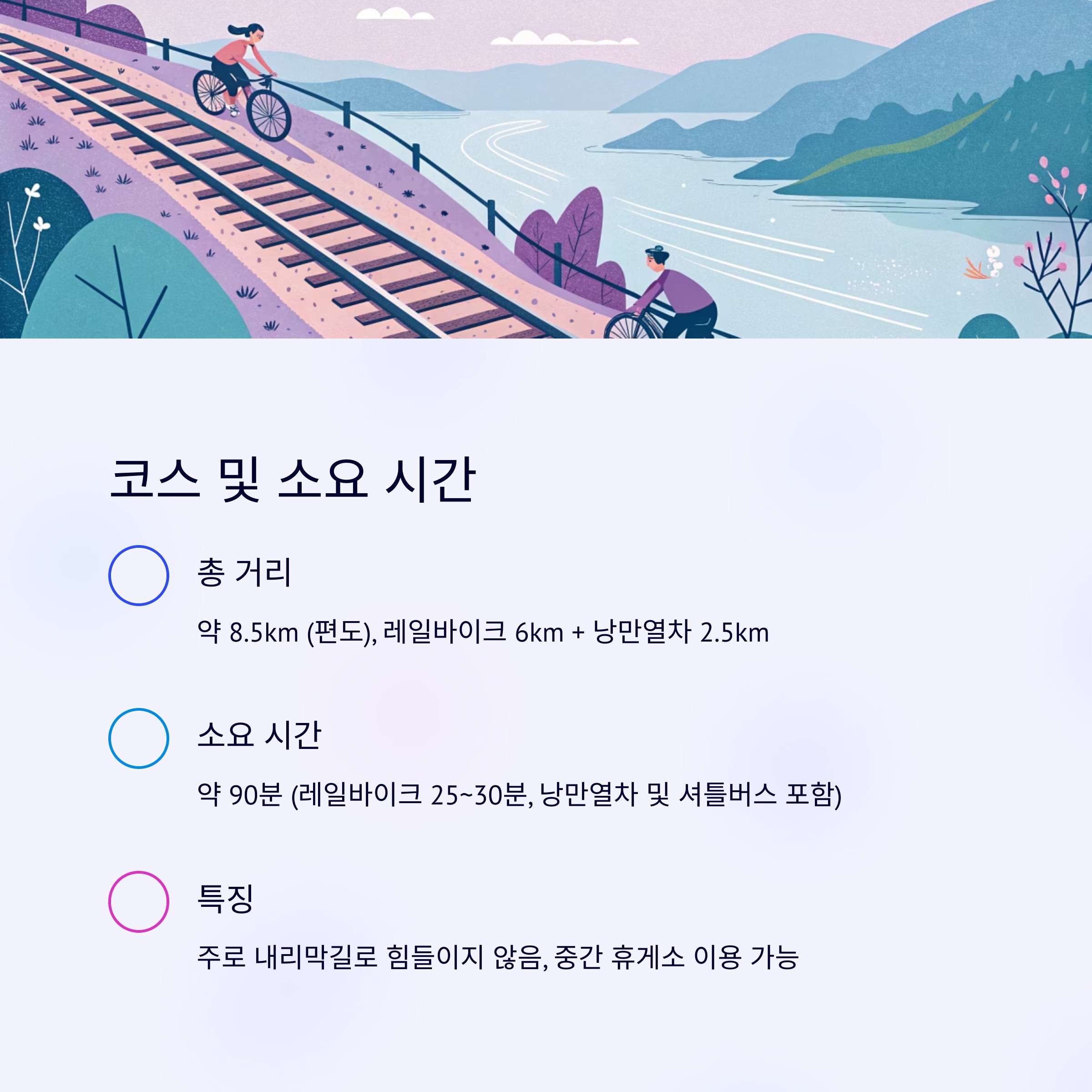 | 레일바이크 구간 | 약 6km | 25~30분 | 김유정역 → 낭구마을 (주로 내리막길) |