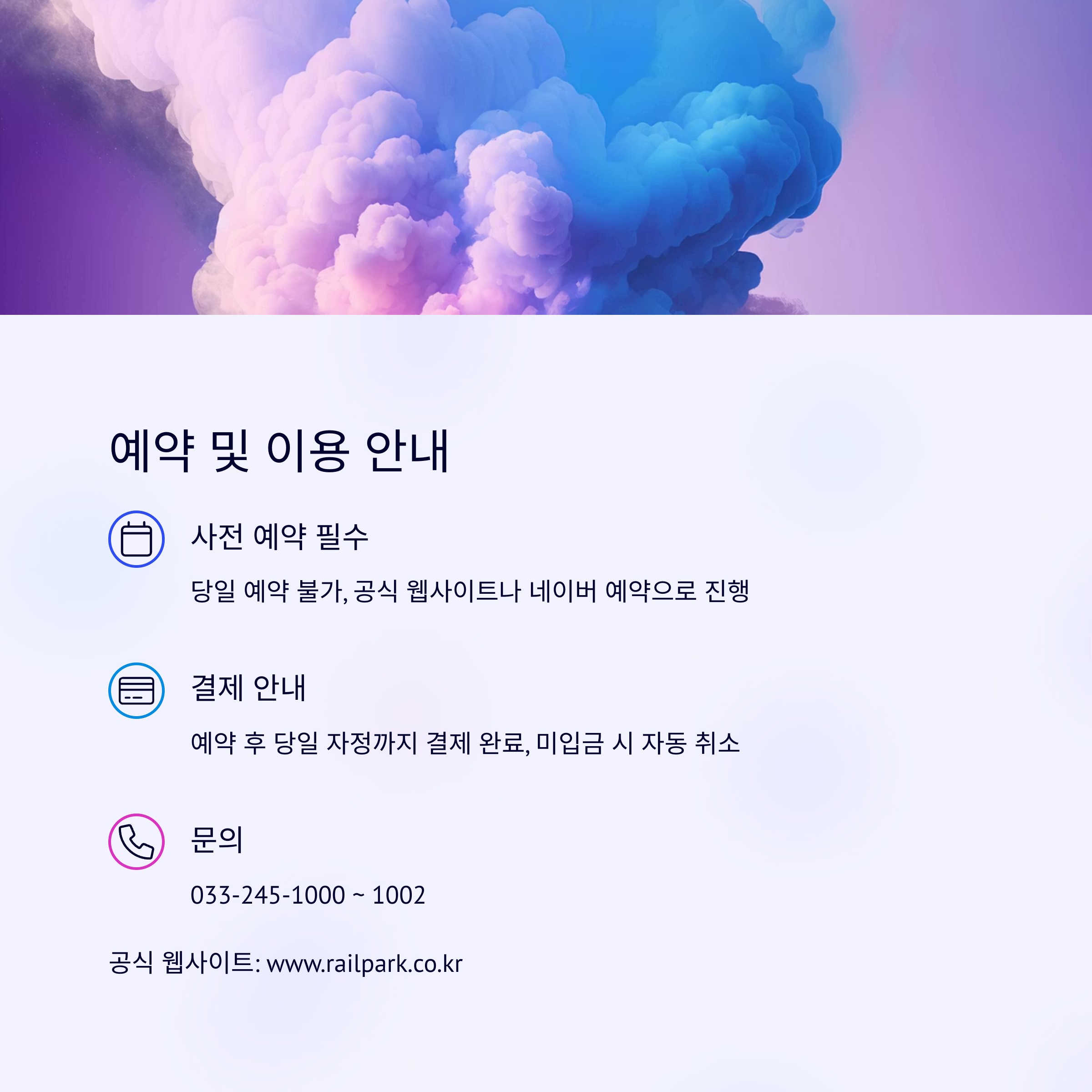 - 결제: 예약 후 당일 자정까지 결제를 완료해야 하며, 미입금 시 자동 취소됩니다.