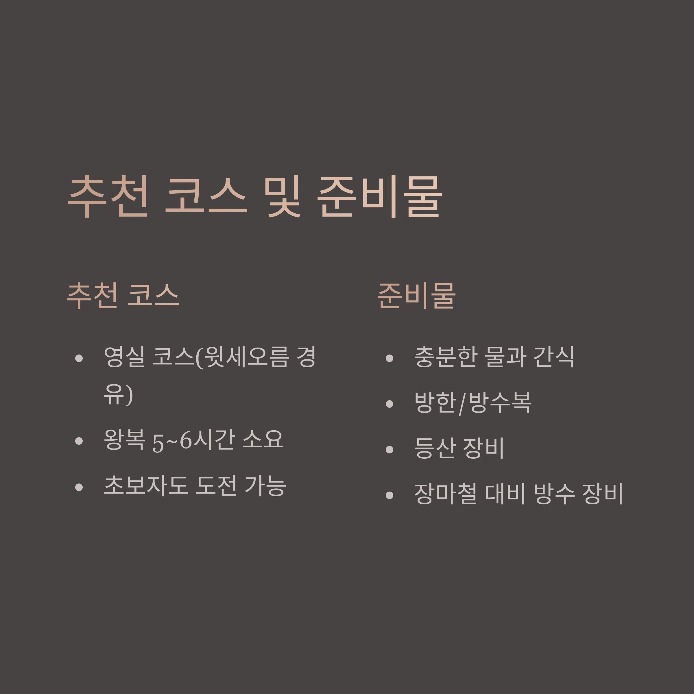 | 장비 | 등산화, 배낭, 헤드랜턴, 우산 |