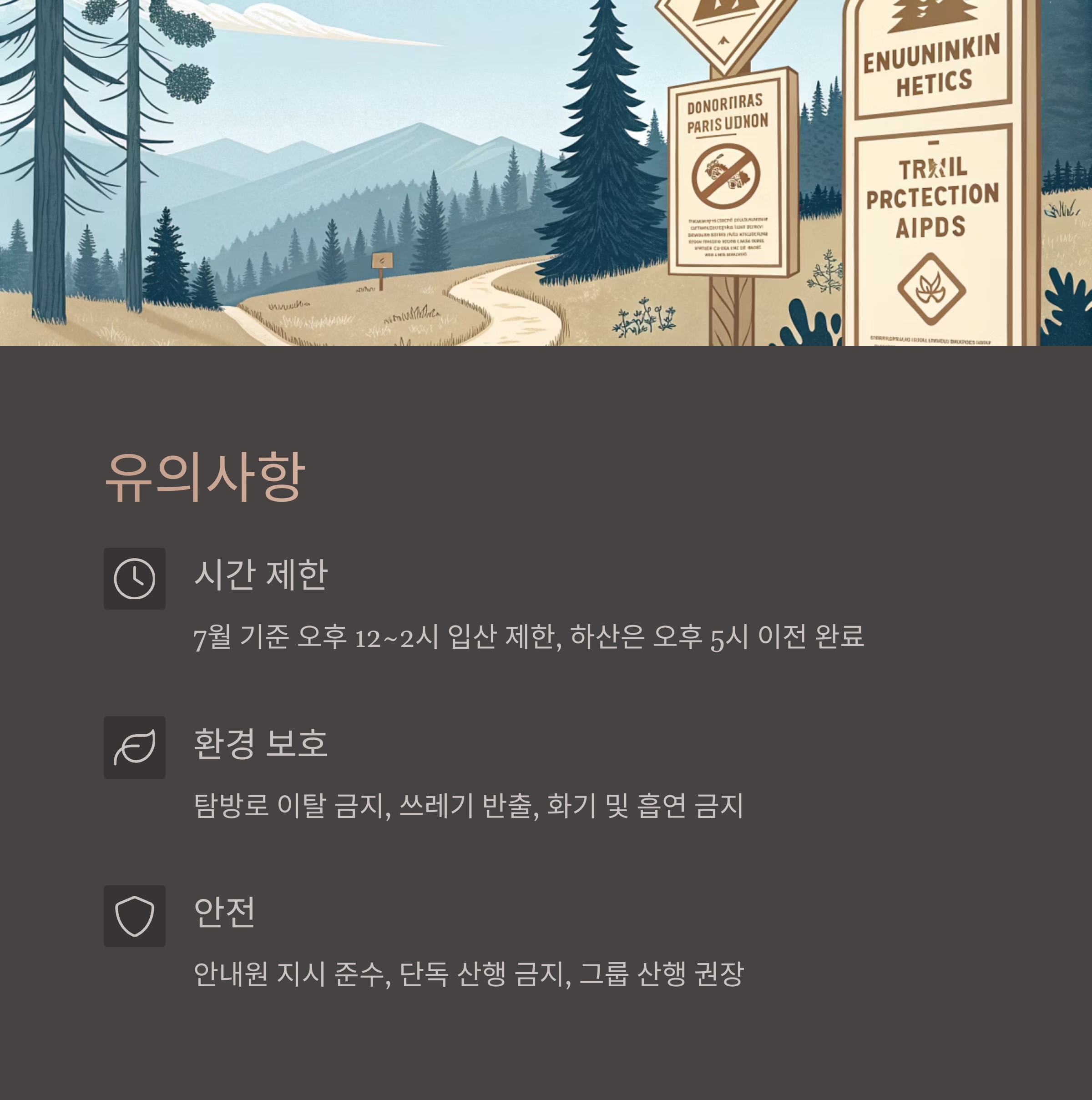 - 안전 수칙: 안내원 지시 준수, 단독 산행 금지