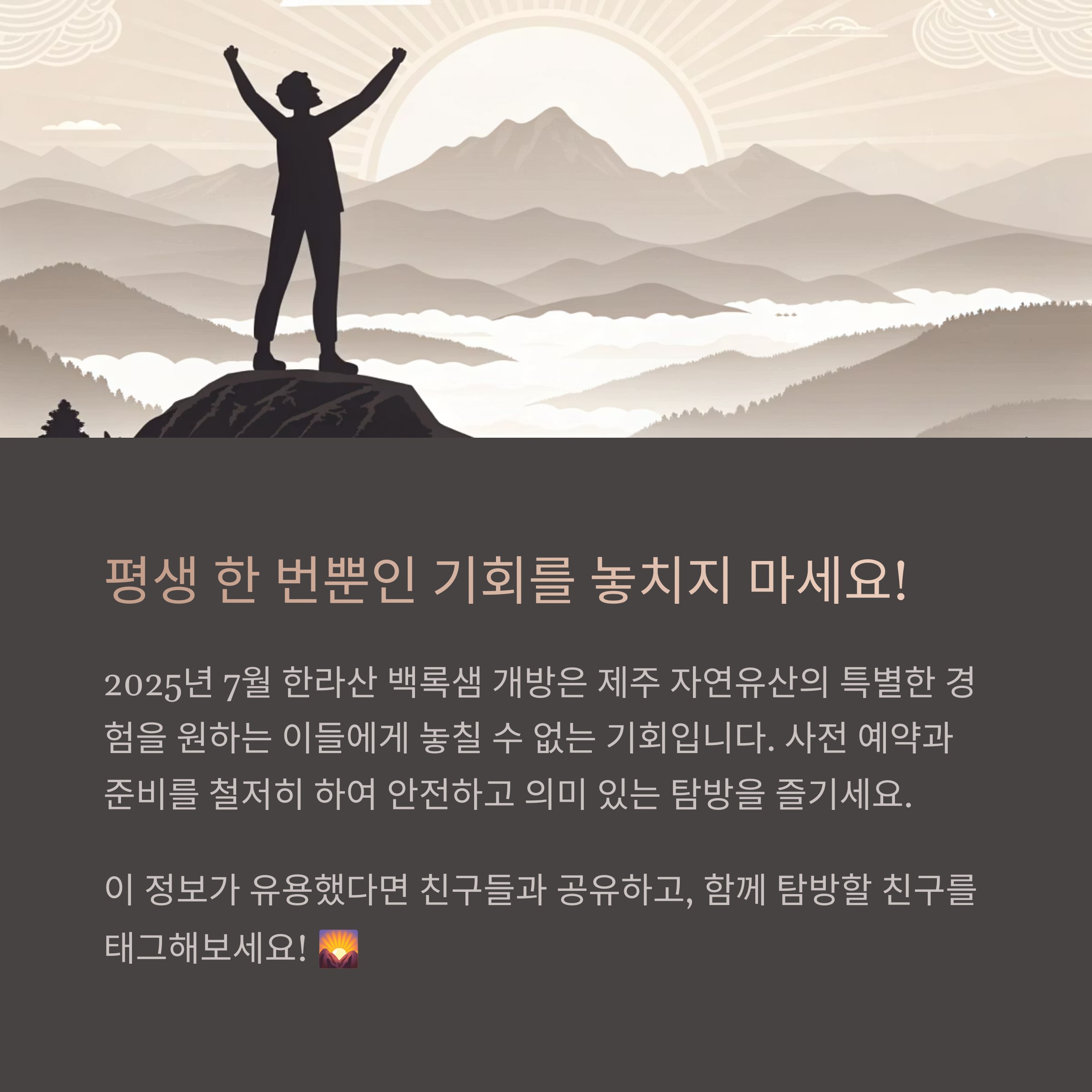 2025년 7월 한라산 백록샘 개방은 제주 자연유산의 특별한 경험을 원하는 이들에게 놓칠 수 없는 기회입니다. 사전 예약과 준비를 철저히 하여 안전하고 의미 있는 탐방을 즐기시기 바랍니다.
