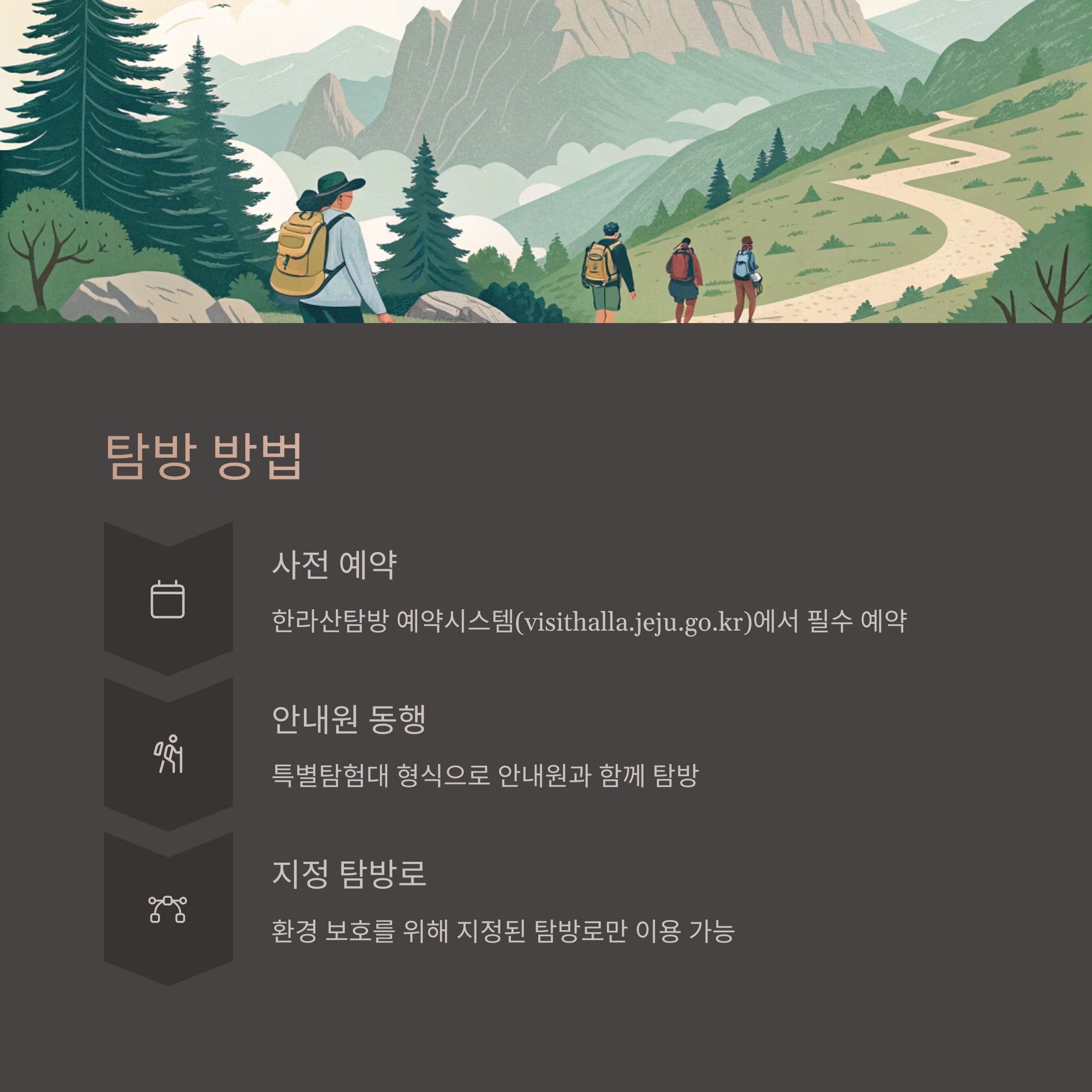 - 탐방로 이탈 금지: 지정된 탐방로만 이용
