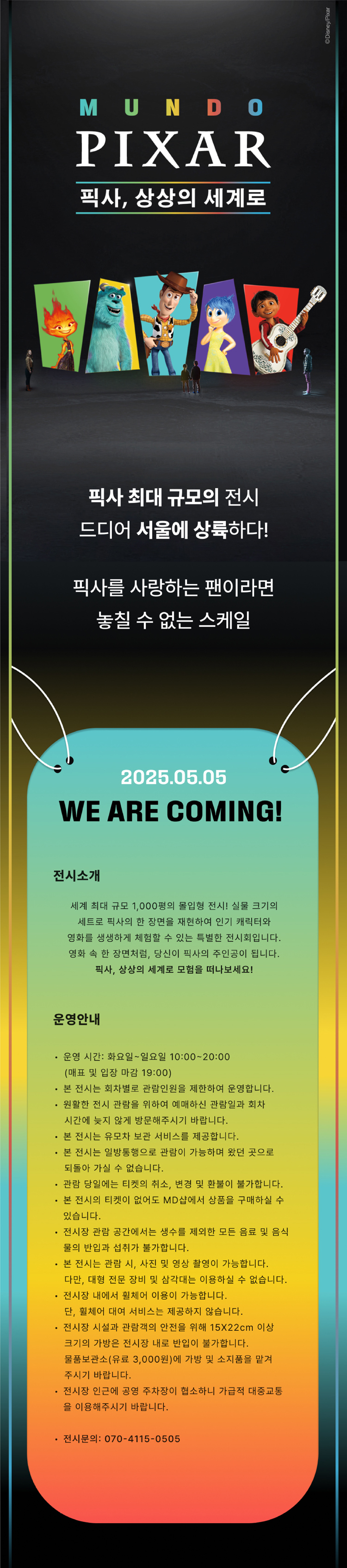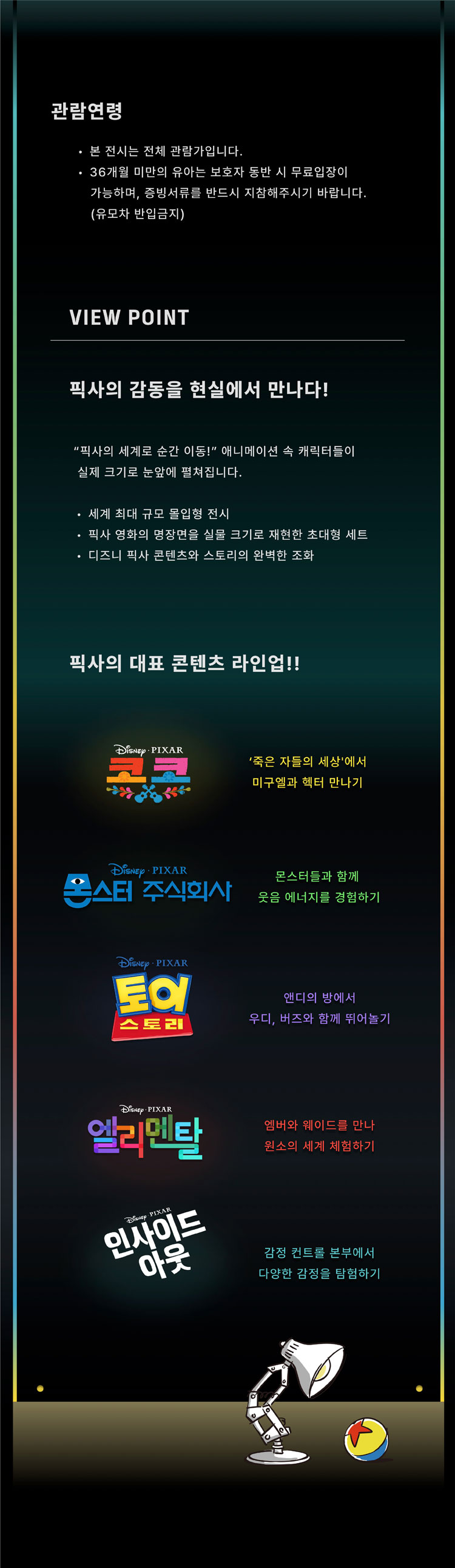 2025년 5월 5일부터 6월 29일까지, 서울 성수문화예술마당에서 펼쳐지는 이 환상적인 여정에 여러분을 초대합니다. 애니메이션을 넘어 현실이 된 픽사의 세계에서 잊지 못할 추억을 만들어보세요.