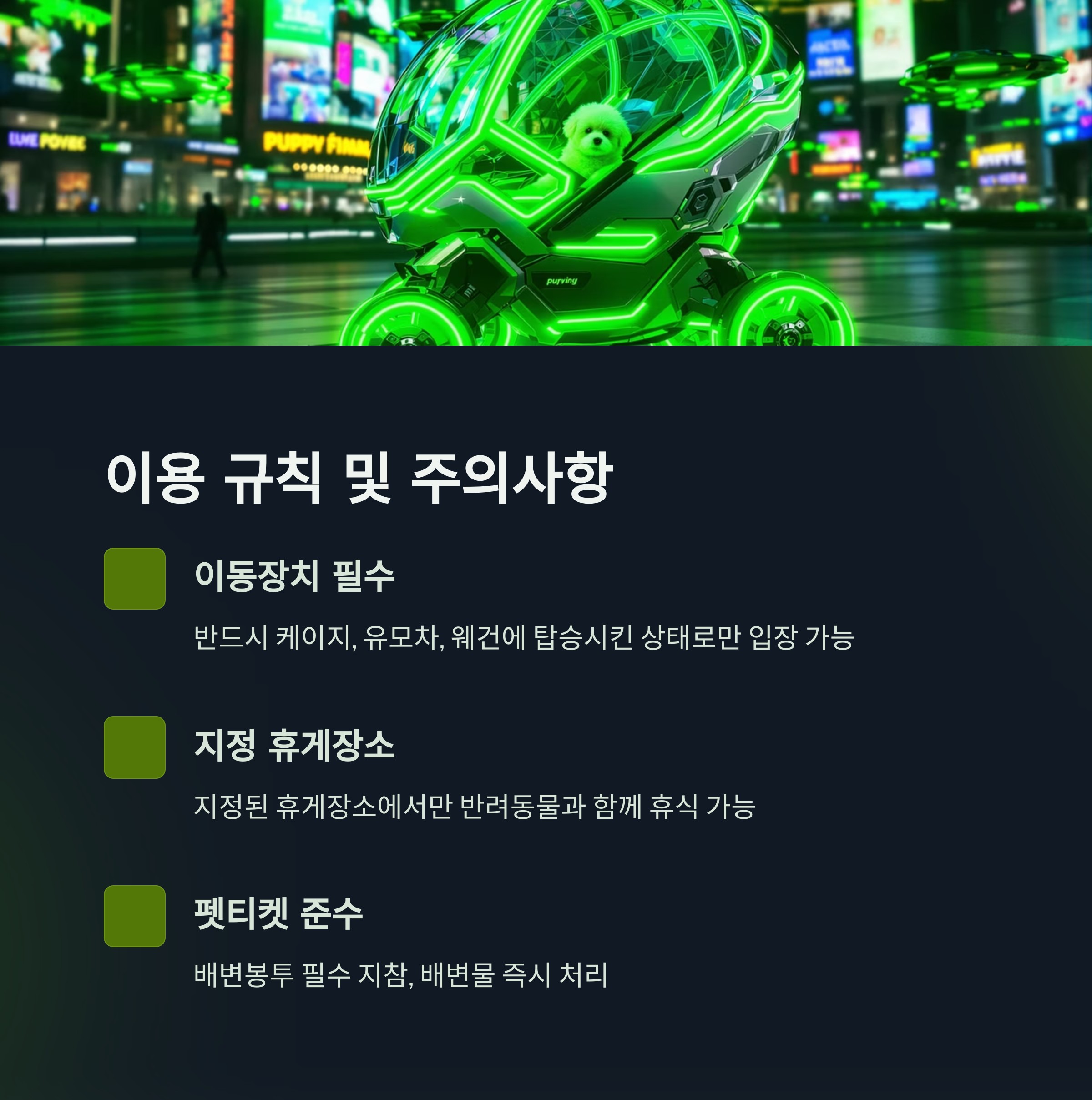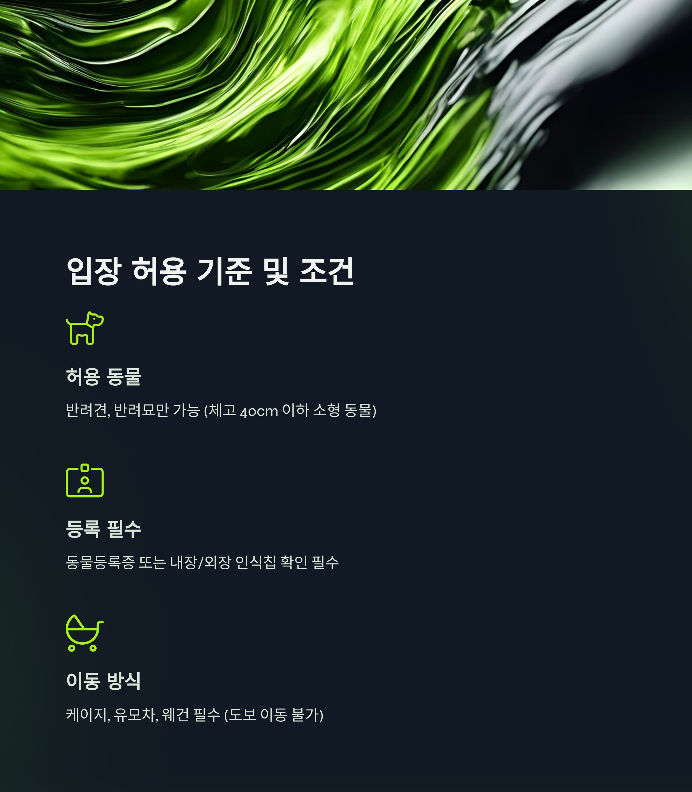 케이지, 유모차, 웨건 등 이동장치에 반려동물을 탑승시킨 상태로만 입장이 가능합니다. 어떠한 경우에도 이동장치 없이 반려동물과 함께 걸어서 입장할 수 없습니다.