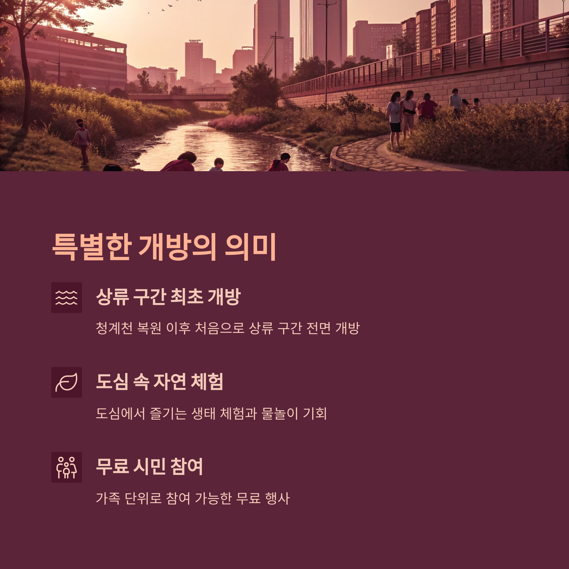 이번 개방은 그동안 출입이 제한되었던 청계천 상류 구간을 시민들이 직접 체험할 수 있는 역사적인 순간으로, 도심 속에서 자연과 물의 소중함을 느낄 수 있는 특별한 기회입니다.