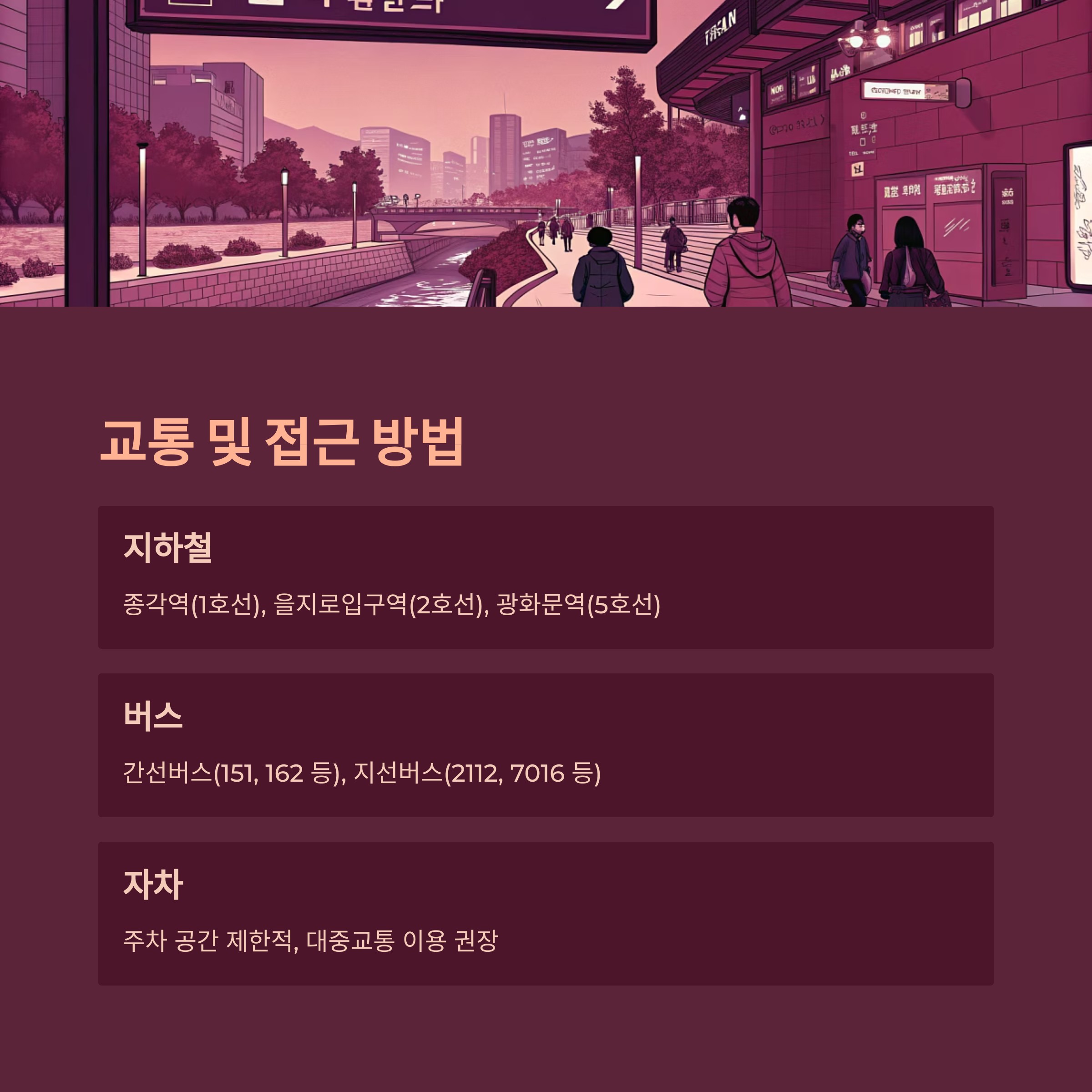 | 종각역 | 1호선 | 3분 | 1번, 2번 출구 |