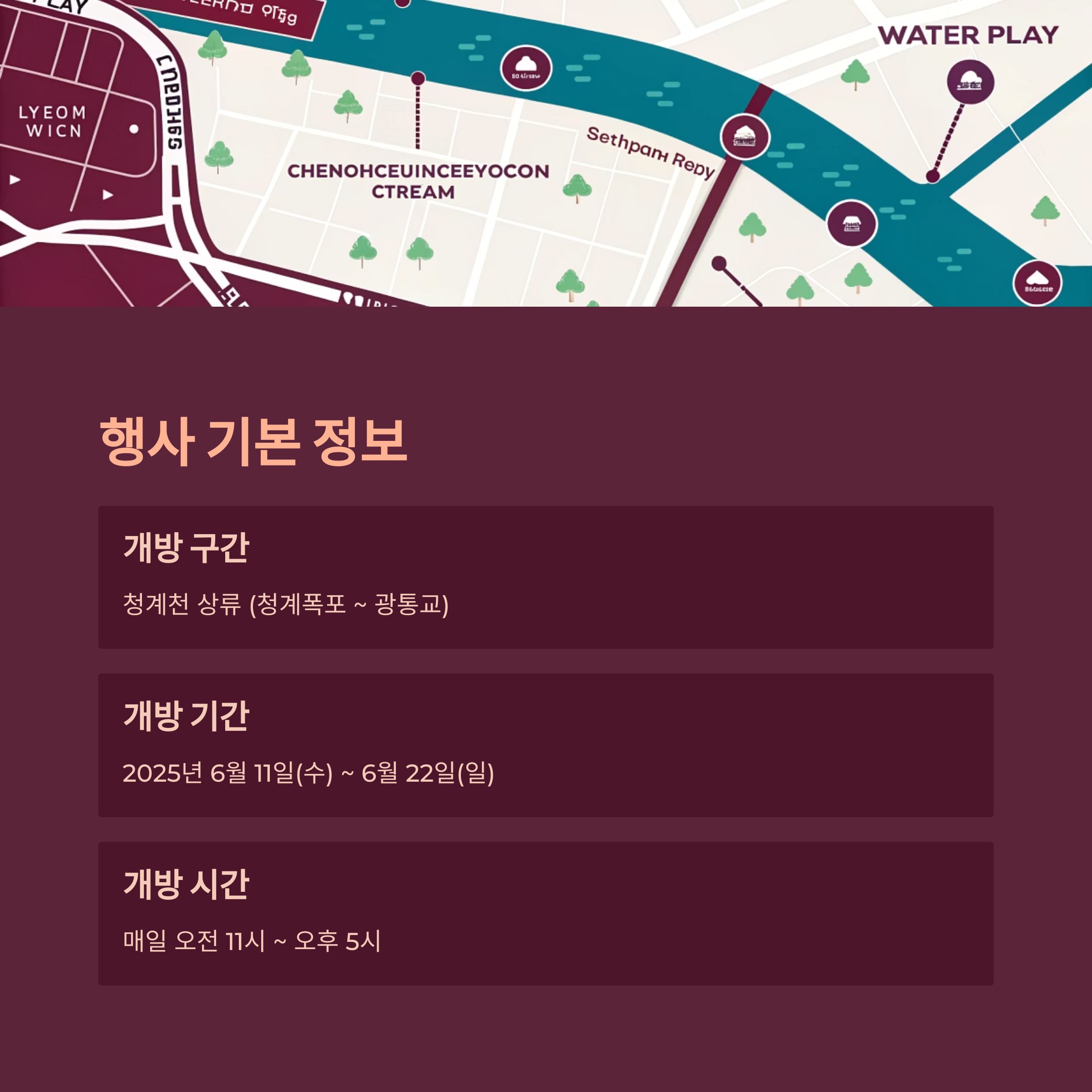 | 개방 구간 | 청계천 상류 (청계폭포 ~ 광통교) |