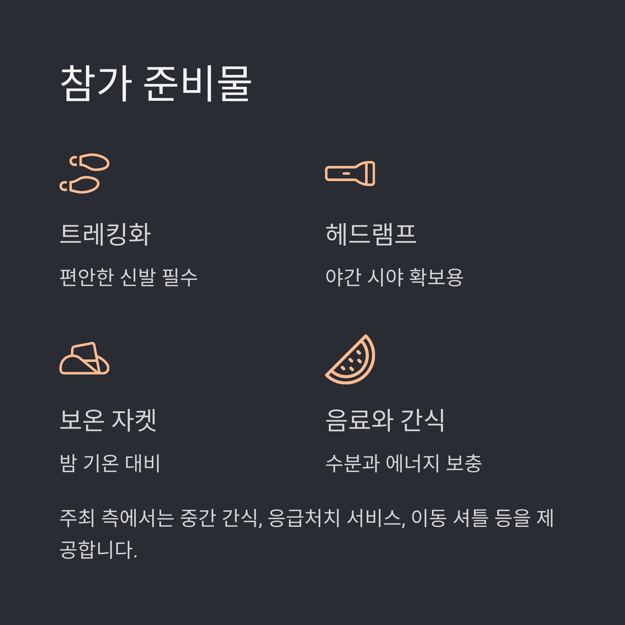 - 편안한 트레킹화와 야간 시야 확보를 위한 헤드램프 또는 손전등을 준비하세요.