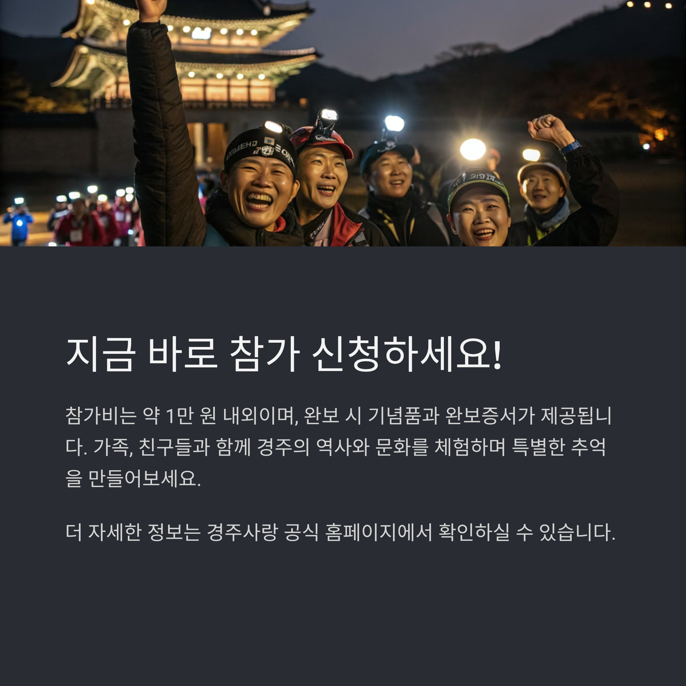 참가자들은 경주의 아름다운 야경과 문화유산을 감상하며, 자신의 한계를 시험하고 새로운 도전에 나설 수 있는 기회를 갖게 됩니다.