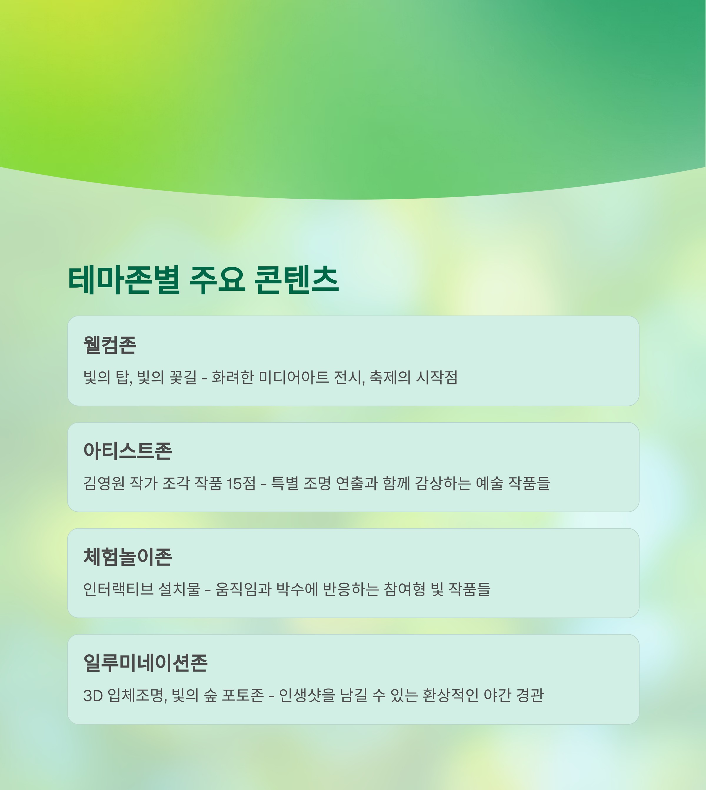 | 일루미네이션존 | 3D 입체조명, 빛의 숲 포토존 | 인생샷을 남길 수 있는 환상적인 야간 경관 |