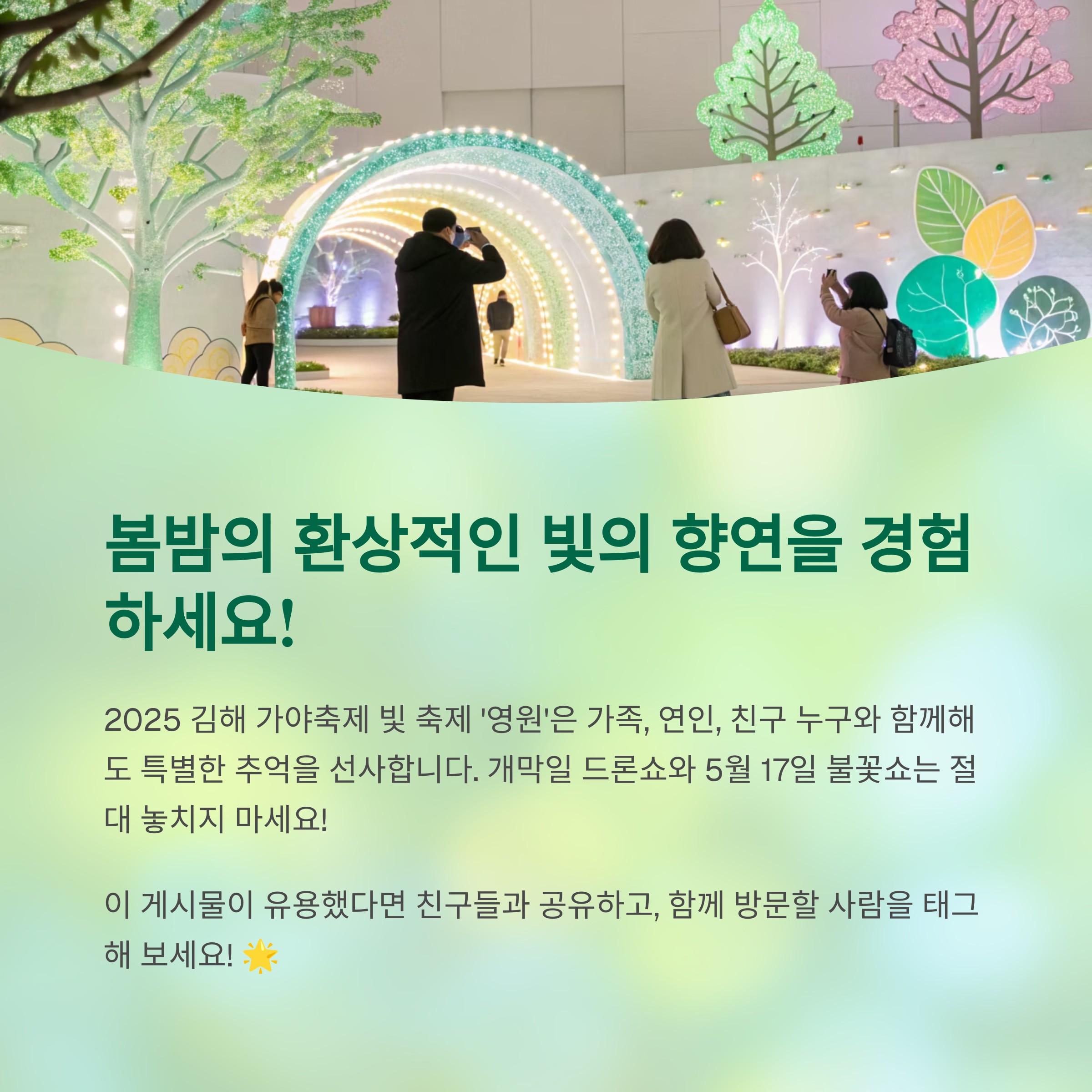 이번 빛 축제 '영원'은 김해시군 통합 30주년을 맞아 특별히 기획된 대규모 야간 축제입니다. 봄밤의 정취와 함께 최첨단 미디어아트와 빛의 예술을 감상할 수 있는 절호의 기회로, 특히 가족 단위 관람객과 연인들에게 잊지 못할 추억을 선사할 것으로 기대됩니다.