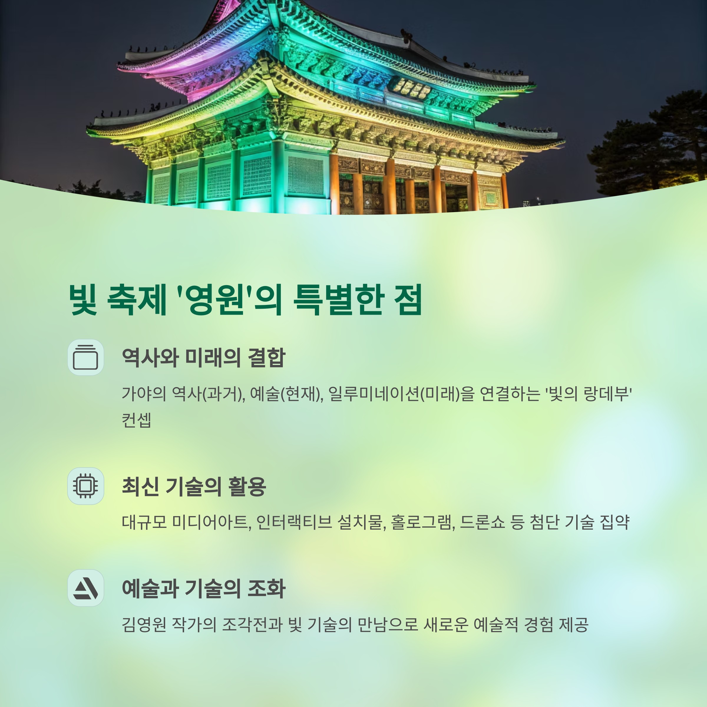 이번 빛 축제 '영원'이 주목받는 이유는 단순한 조명 축제를 넘어 다양한 특별 요소들이 결합되어 있기 때문입니다.