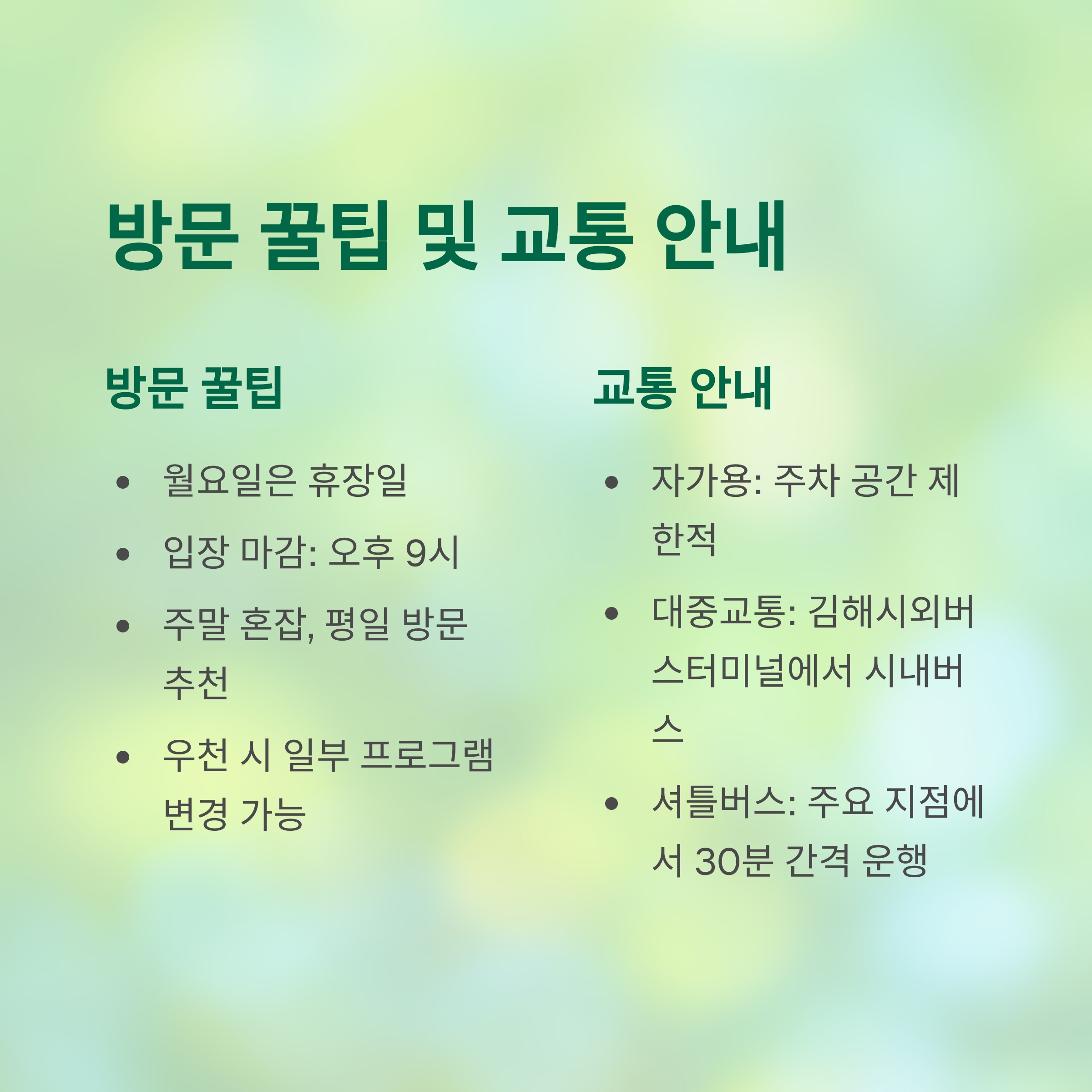 | 셔틀버스 | 김해시청, 김해문화의전당 등 주요 지점에서 무료 셔틀버스 운행 (30분 간격) |