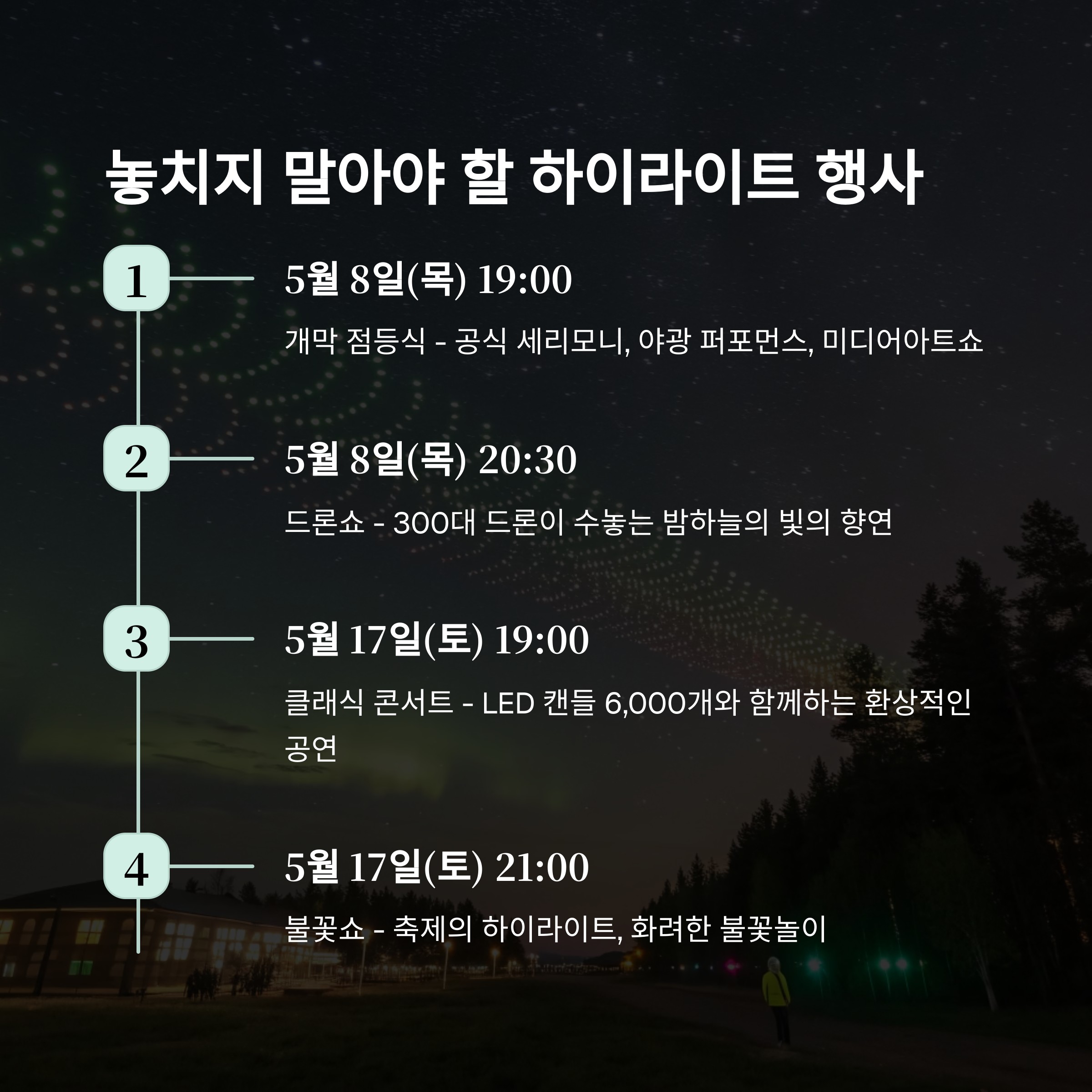 개막일인 5월 8일에는 축제의 시작을 알리는 화려한 점등식과 함께 야광 퍼포먼스가 준비되어 있으며, 특히 밤하늘을 수놓는 드론쇼는 이번 축제의 하이라이트 중 하나입니다. 또한 축제 폐막을 앞둔 5월 17일(토)에는 LED 캔들 6,000개가 만들어내는 환상적인 분위기 속에서 클래식 콘서트와 불꽃쇼가 펼쳐져 관람객들에게 잊지 못할 추억을 선사할 예정입니다.