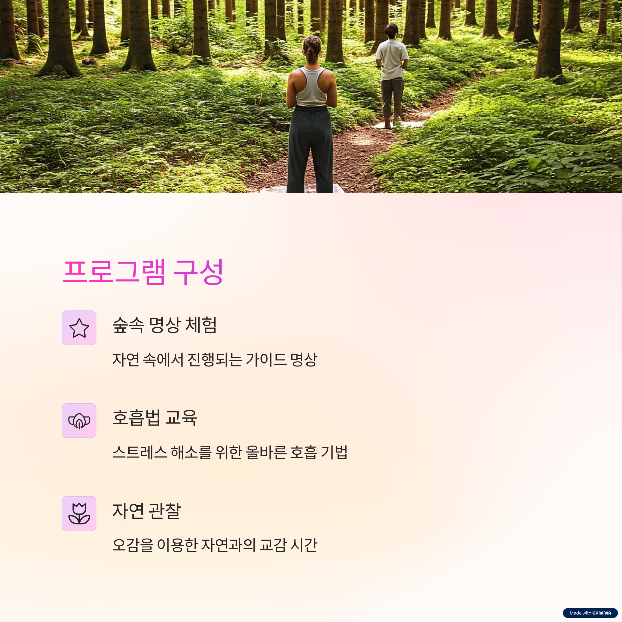 - 숲속 명상 체험: 자연 속에서 진행되는 가이드 명상