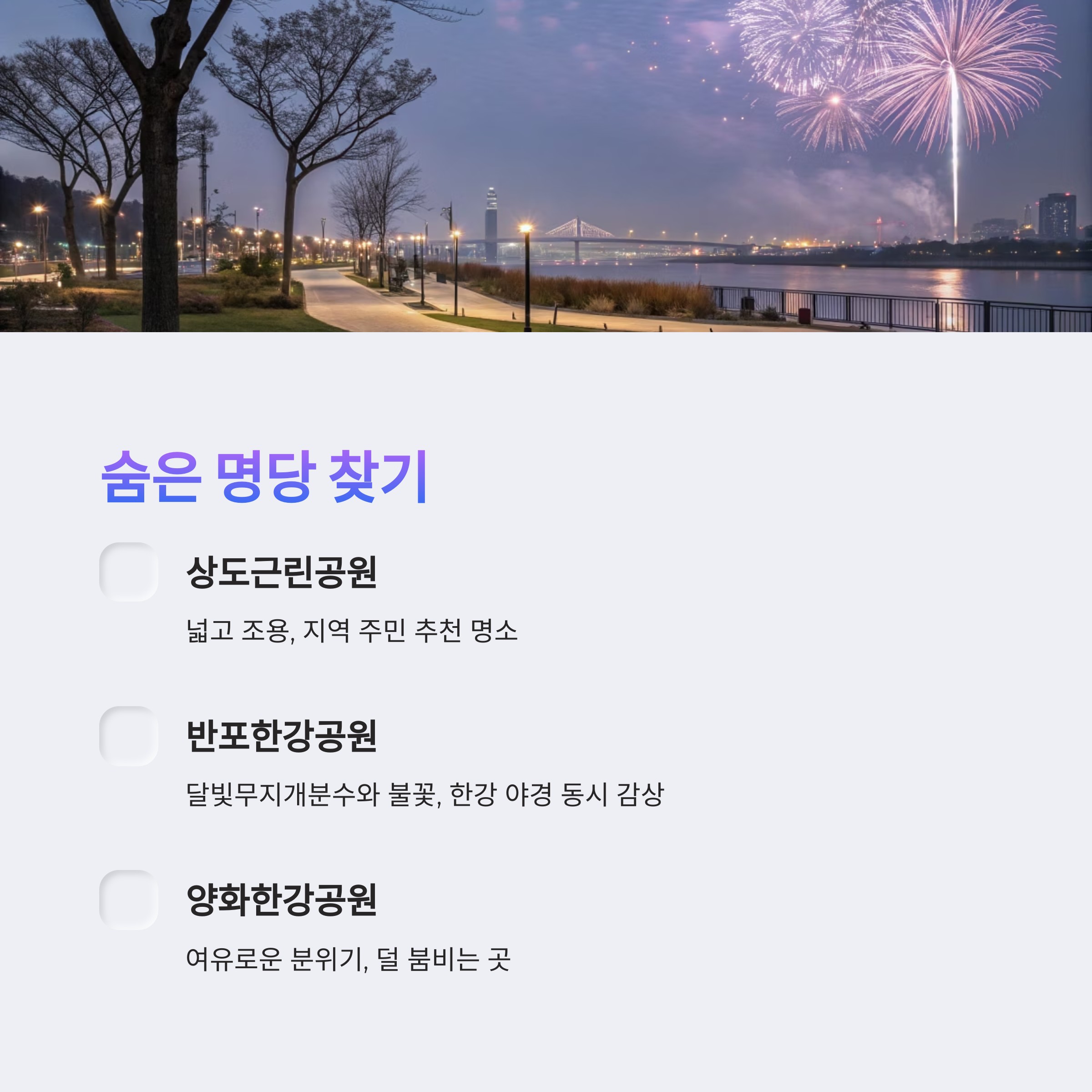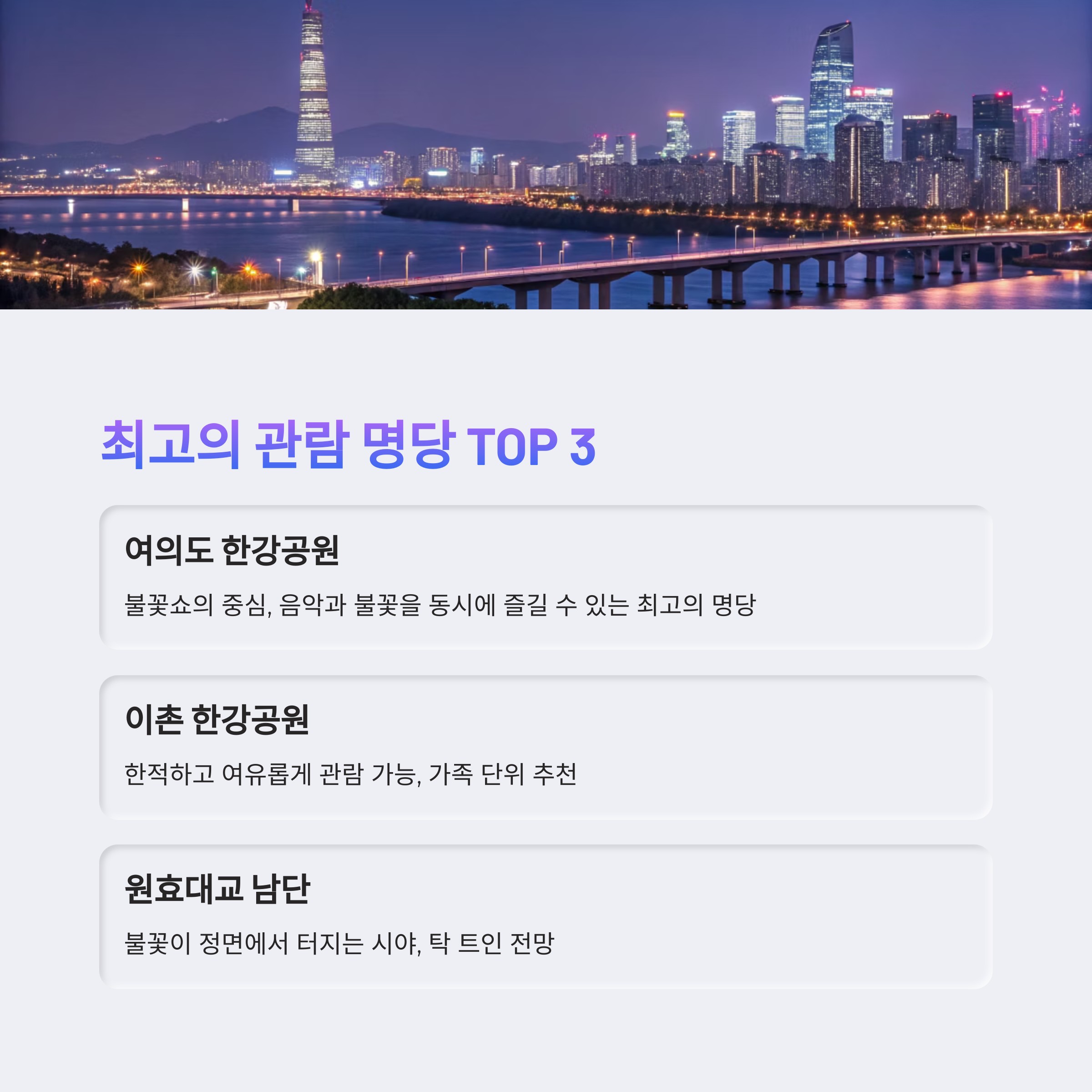 | 1위 | 여의도 한강공원 | 불꽃쇼의 중심, 음악과 불꽃을 동시에 즐길 수 있는 최고의 명당 | 매우 붐빔, 일찍 도착 필수 | 5호선 여의나루역 3번 출구 |