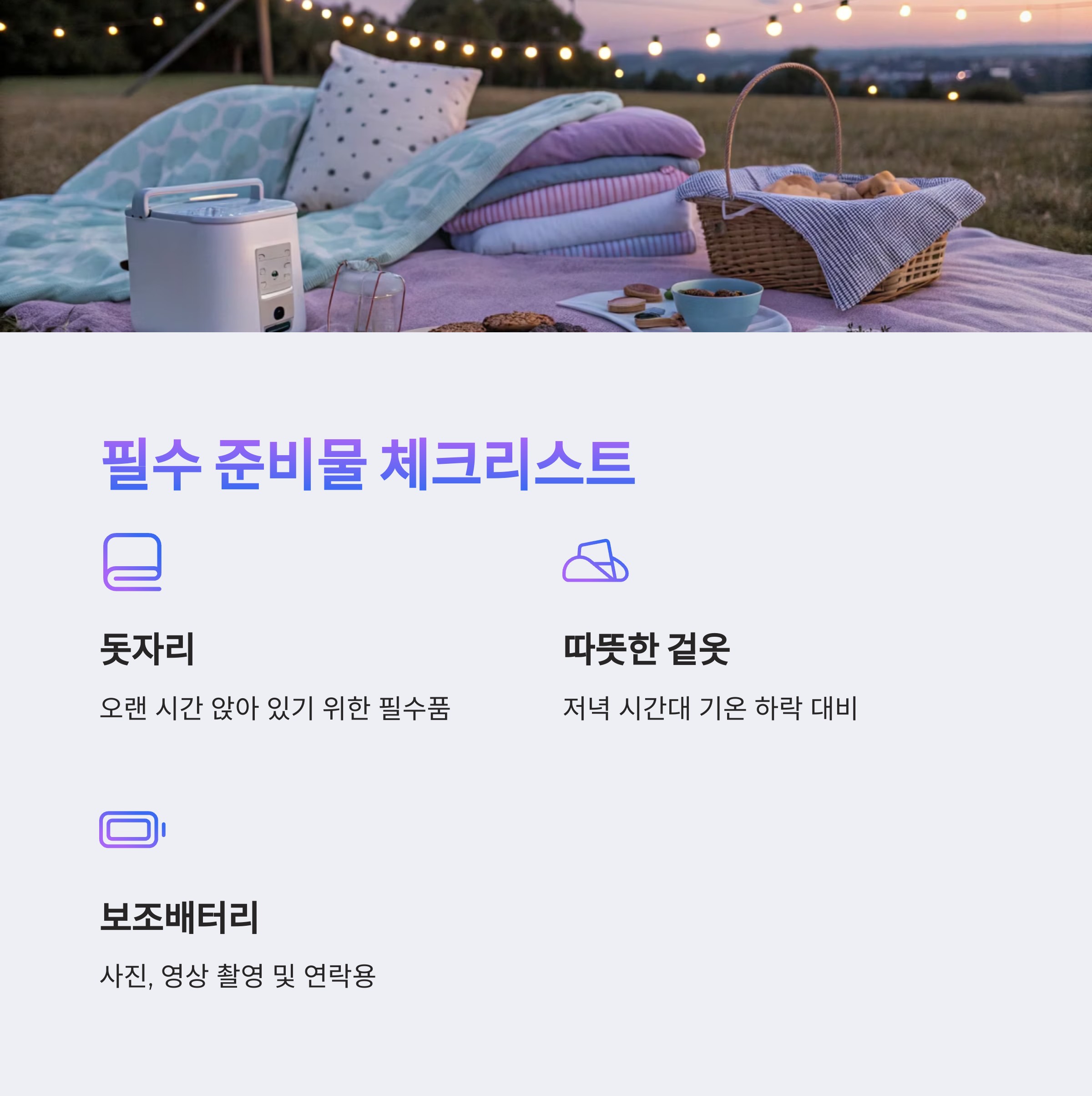 - ✓ 돗자리 - 오랜 시간 앉아 있기 위한 필수품