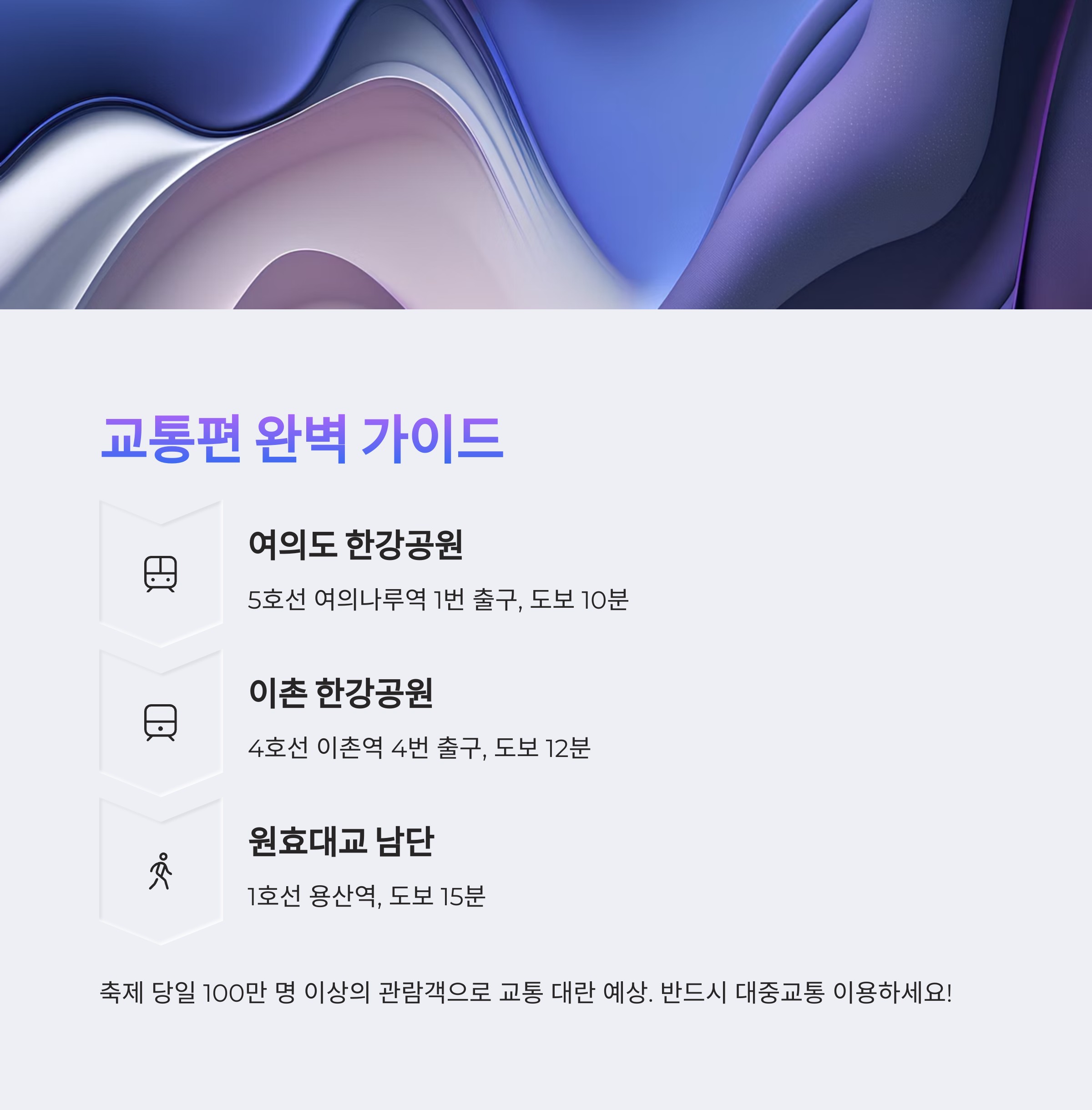 축제 당일에는 100만 명 이상의 관람객이 몰리기 때문에 교통 대란이 예상됩니다. 반드시 대중교통을 이용하시고, 여유 시간을 두고 이동하세요.