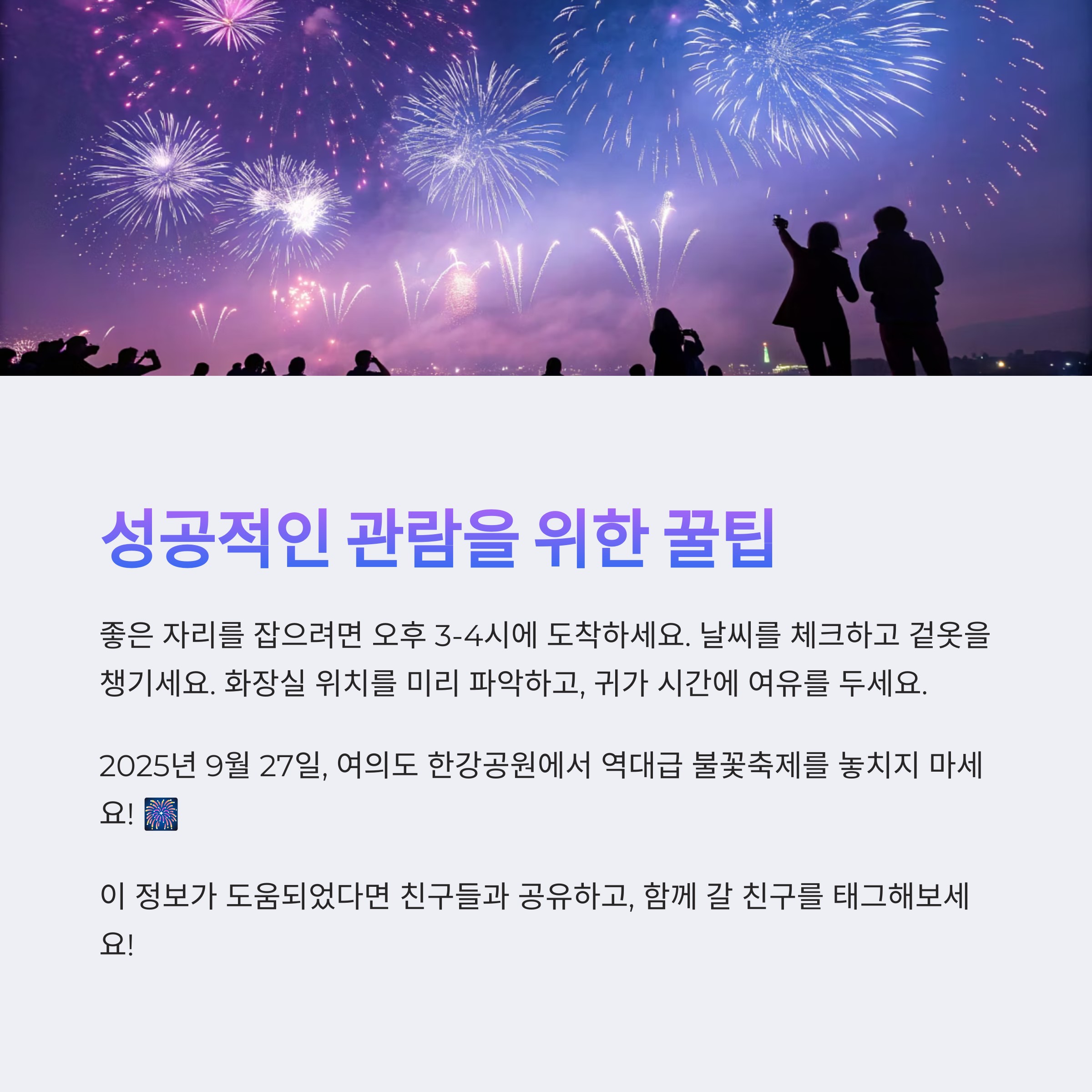완벽한 준비와 함께라면 분명 환상적인 불꽃축제를 즐기실 수 있을 것입니다. 서울의 가을밤을 화려하게 수놓을 불꽃의 향연을 놓치지 마세요!