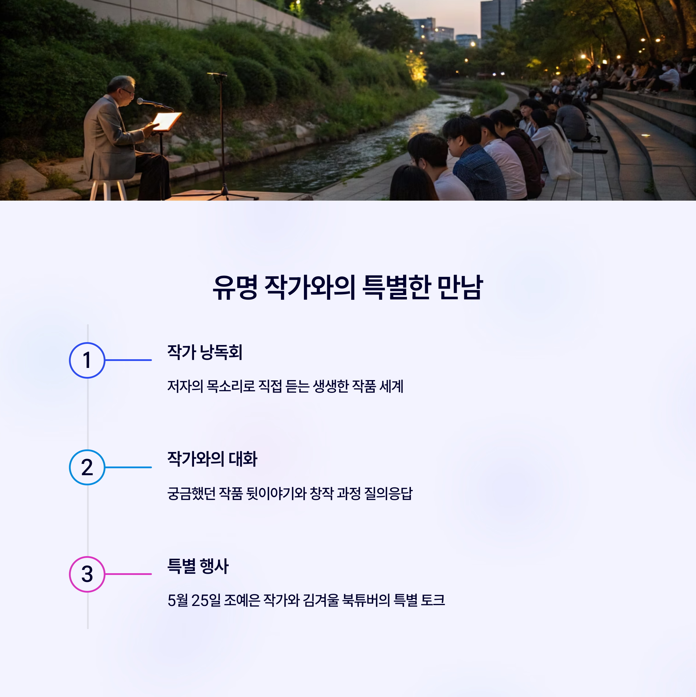 서울의 도심 속 자연 공간인 청계천이 책과 문화, 휴식이 어우러진 특별한 야외 도서관으로 변신합니다. 서울도서관이 운영하는 '책 읽는 맑은 냇가'는 서울야외도서관의 혁신적인 모델로서, 시민들에게 청계천의 물소리와 함께 편안하게 독서를 즐길 기회를 제공합니다. 2025년 봄부터 가을까지 진행되는 이 매력적인 행사에 대한 상세 정보를 종합하여 알려드립니다.