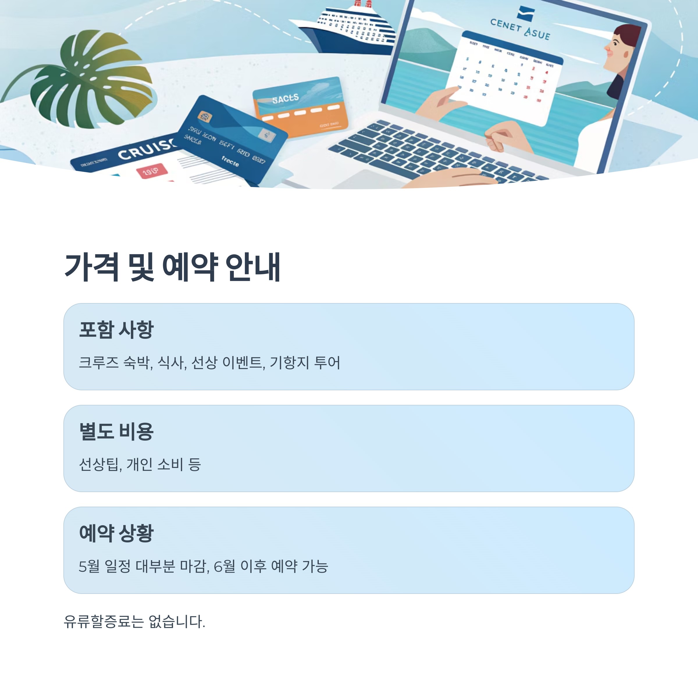 주의사항: 예약 시 여권 정보가 필요하니 여권을 미리 준비해 주세요. 또한 크루즈 예약은 출항 60일 전까지 완료하는 것이 좋습니다.