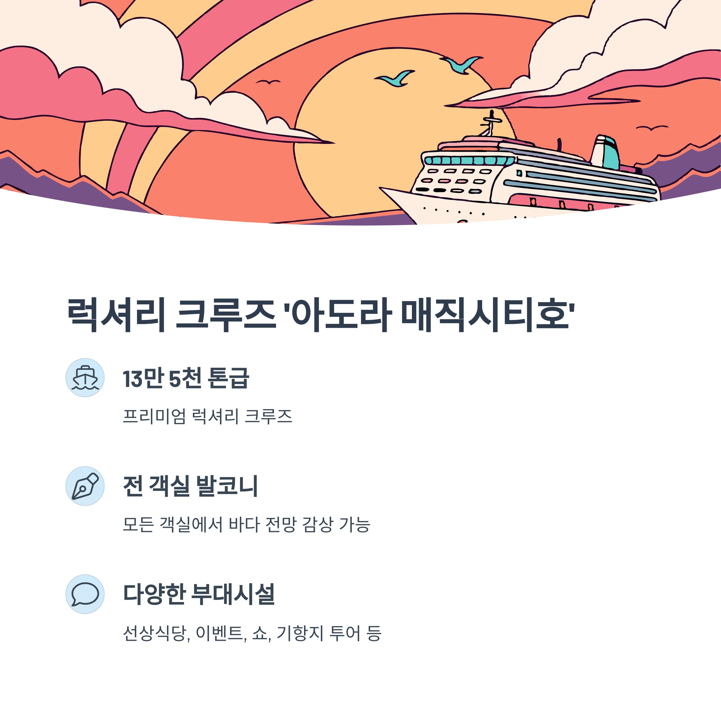 아도라 매직시티호(13만 5천 톤급)는 최신 시설을 갖춘 프리미엄 럭셔리 크루즈십입니다. 전 객실이 발코니를 갖춘 프리미엄 객실로 구성되어 있어, 어느 객실에서든 아름다운 바다 전망을 감상할 수 있습니다.